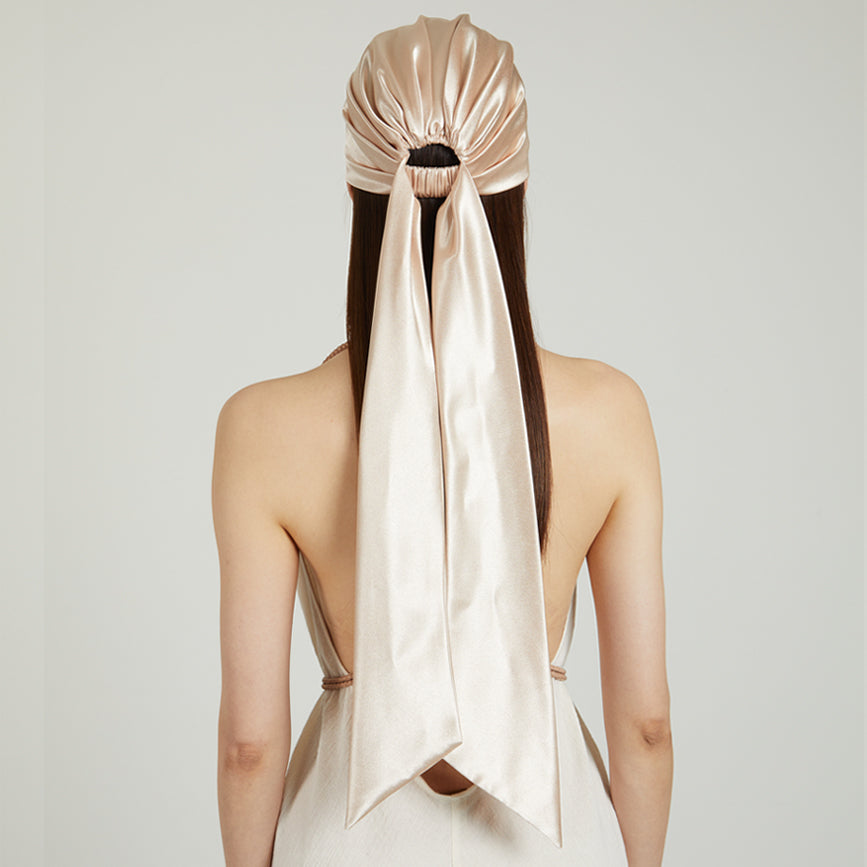 Champagne shiny satin headscarf with 14KT gold logo plate-tipped tails.