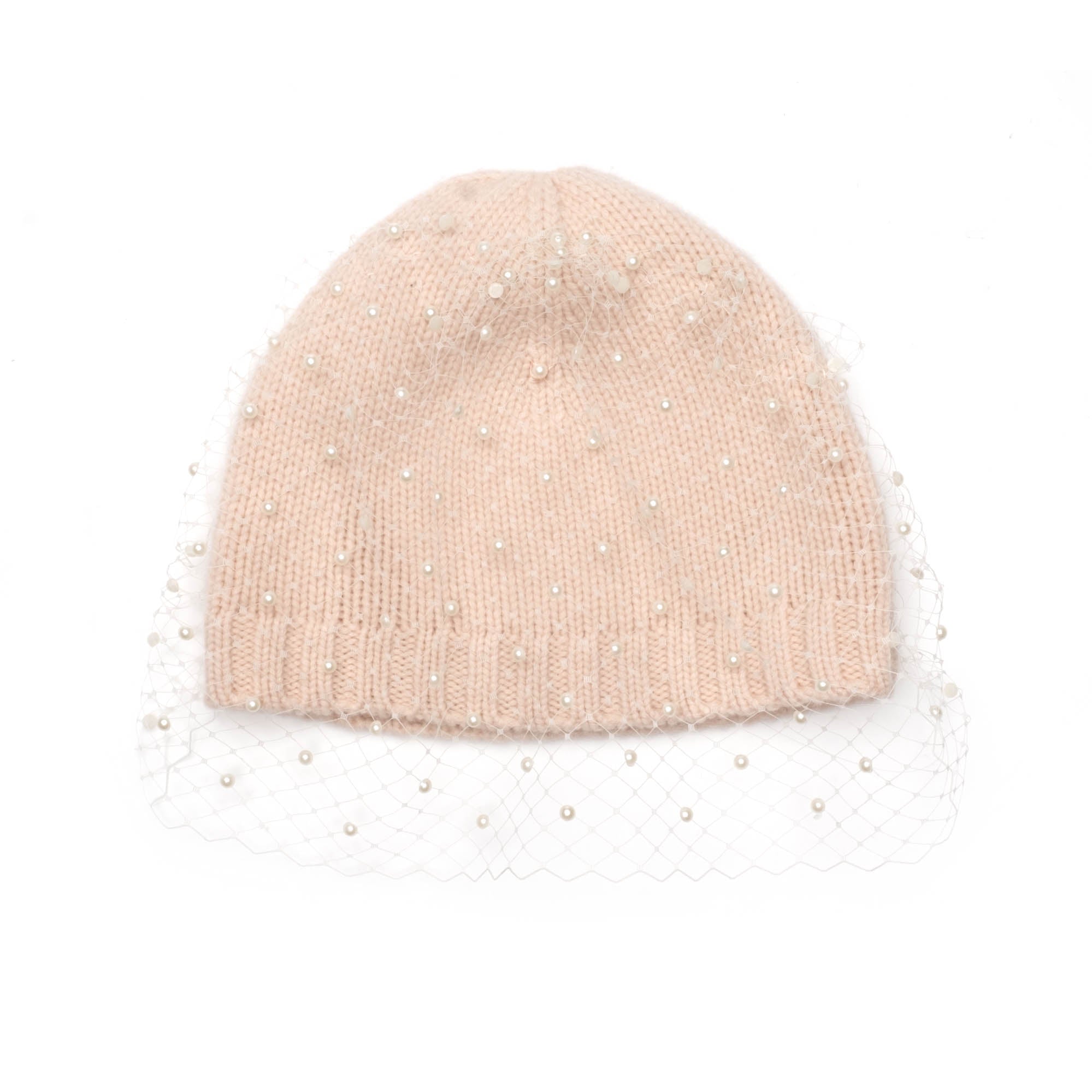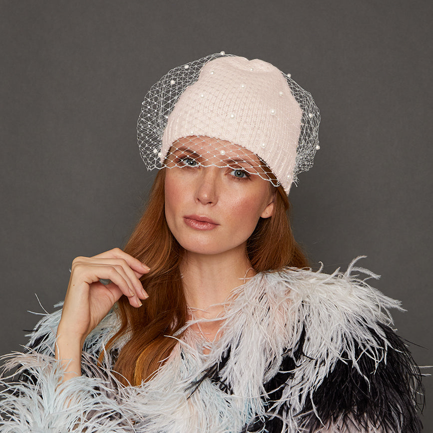 Style: Blush cashmere knit beanie with pearl-encrusted ivory birdcage veil