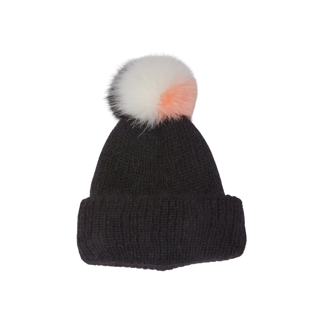 Black Italian angora knit beanie with pink/white/black faux fox pom.