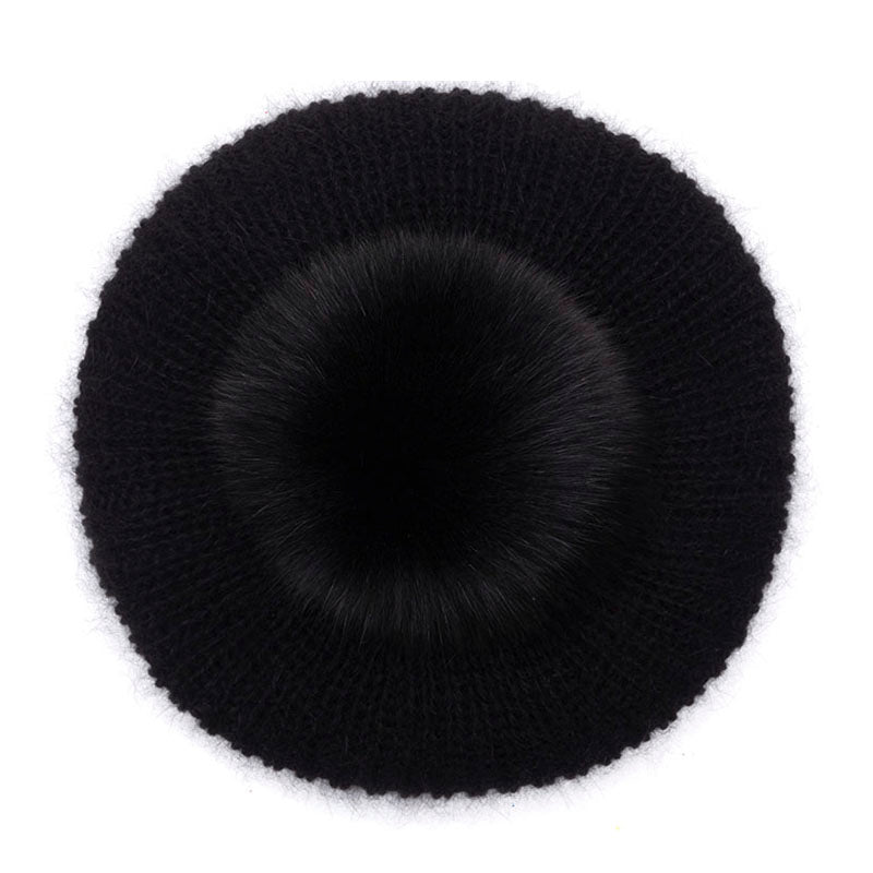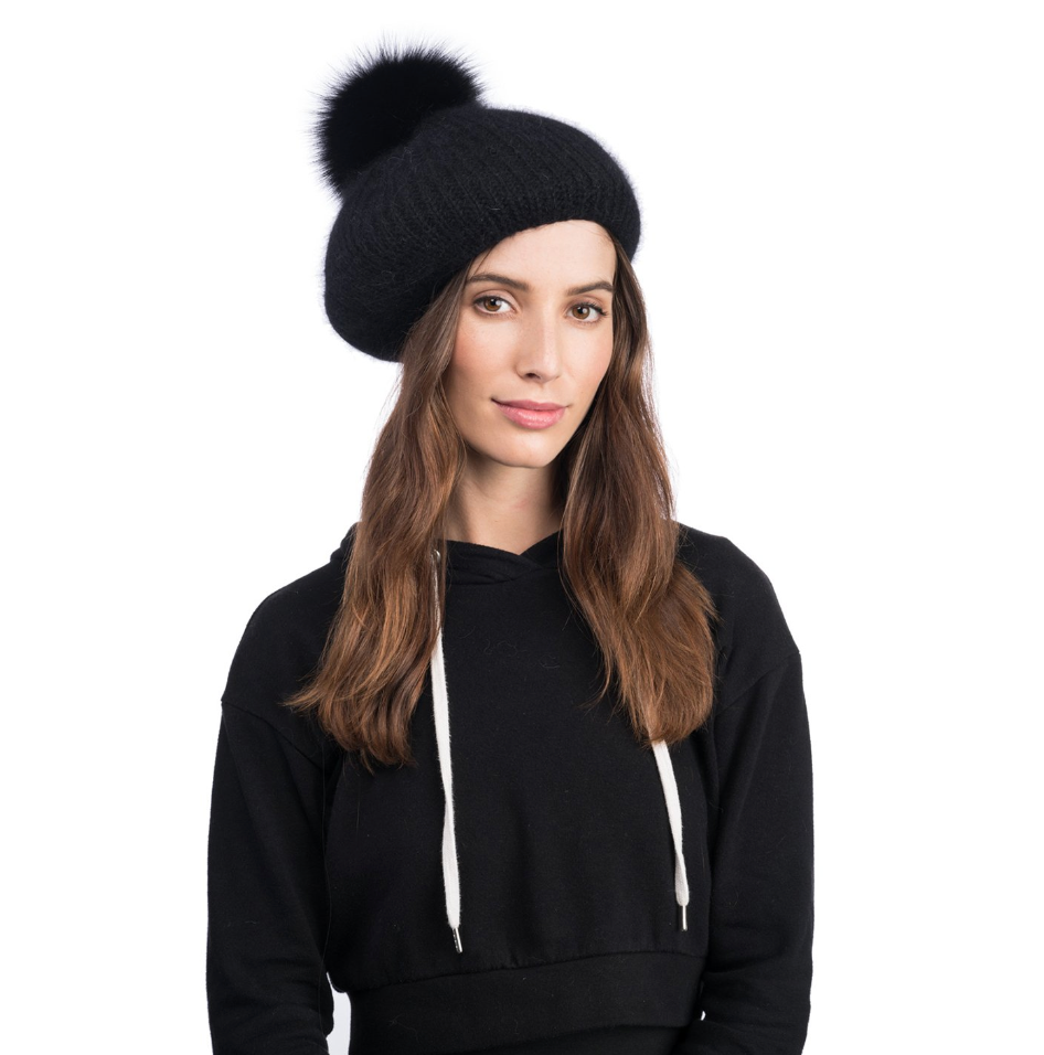 The Rochelle, from the Eugenia Kim Core Collection is a Black angora knit beret, complemented by a tonal black fox fur pom.