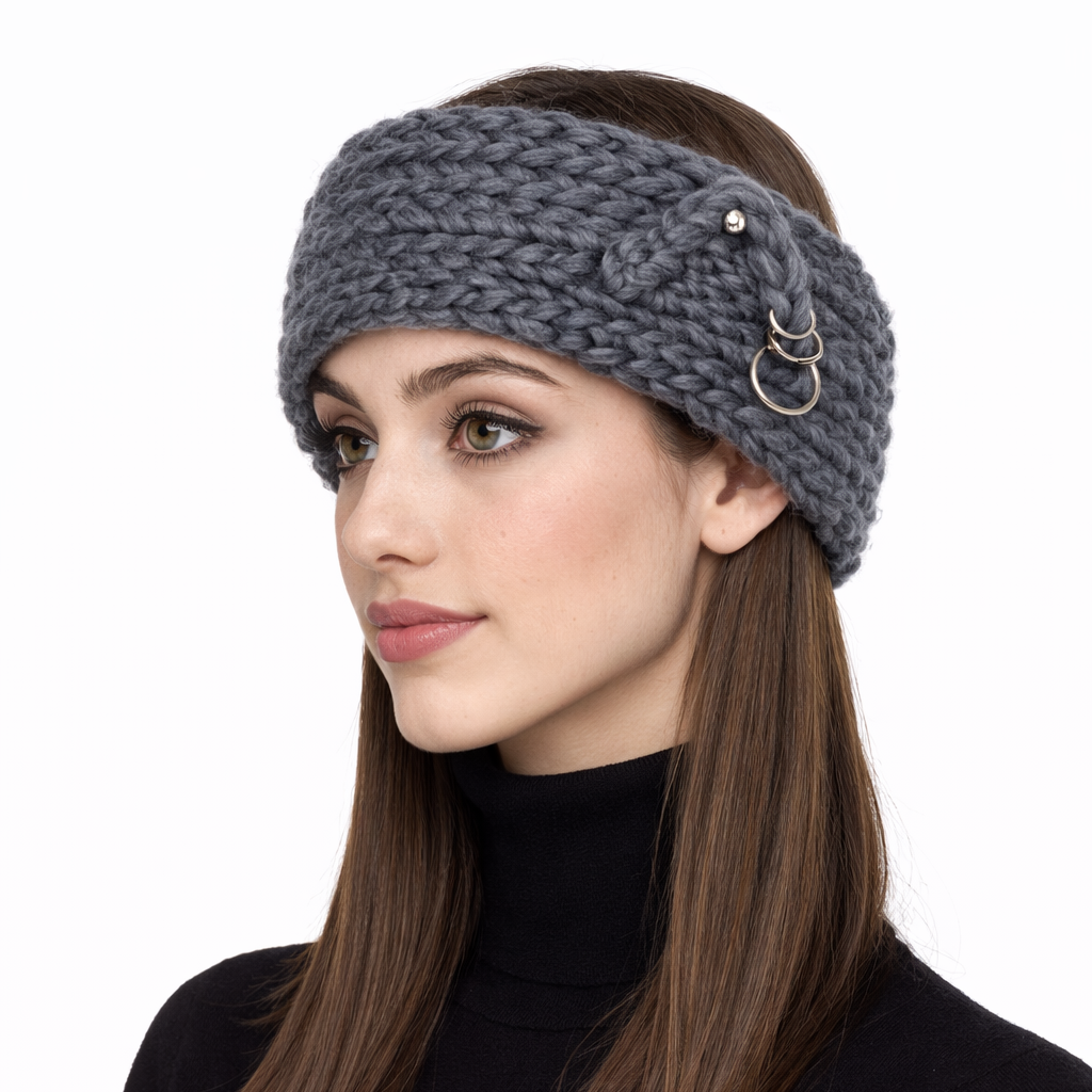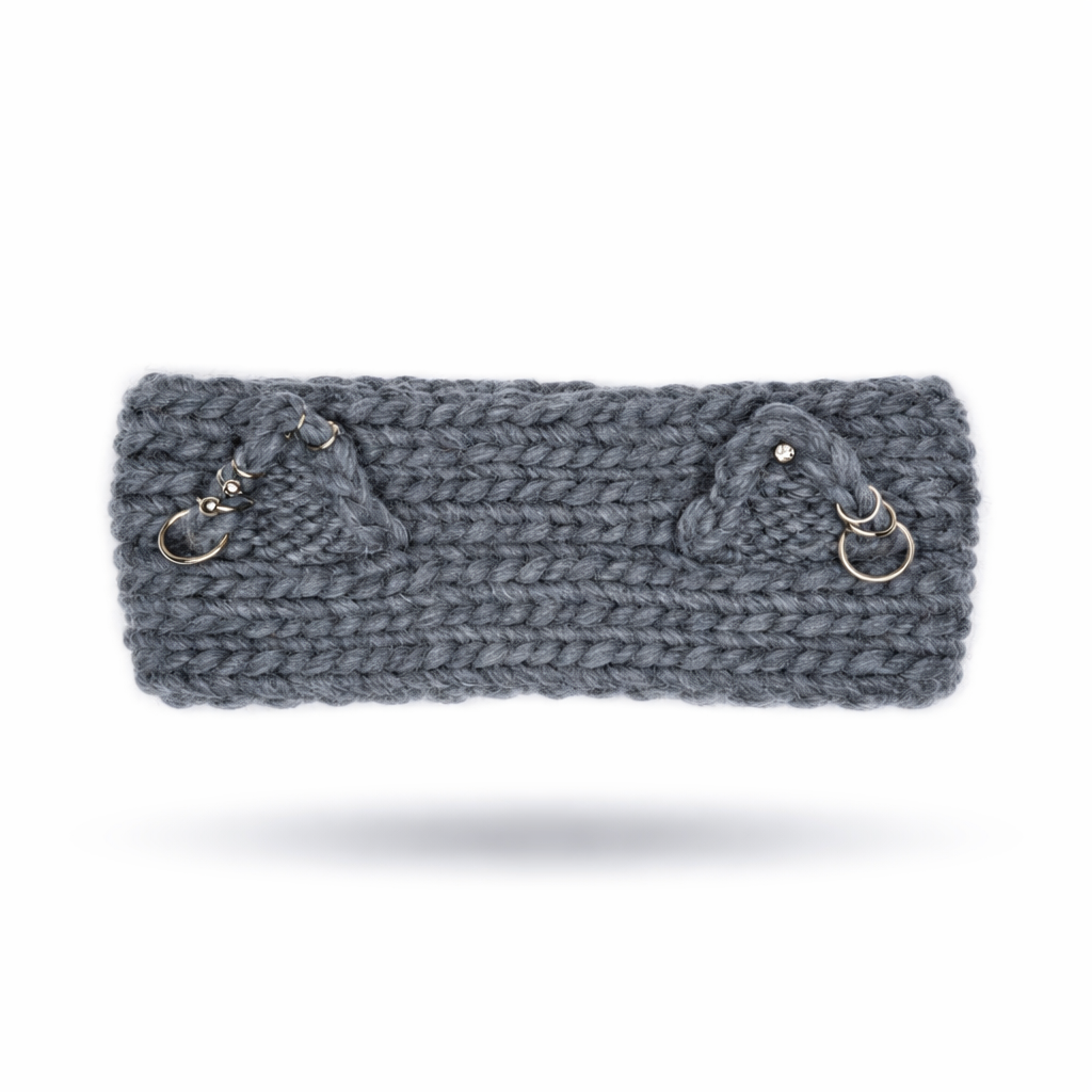 Charcoal chunky wool hand-knit headband with silver pierced ears.