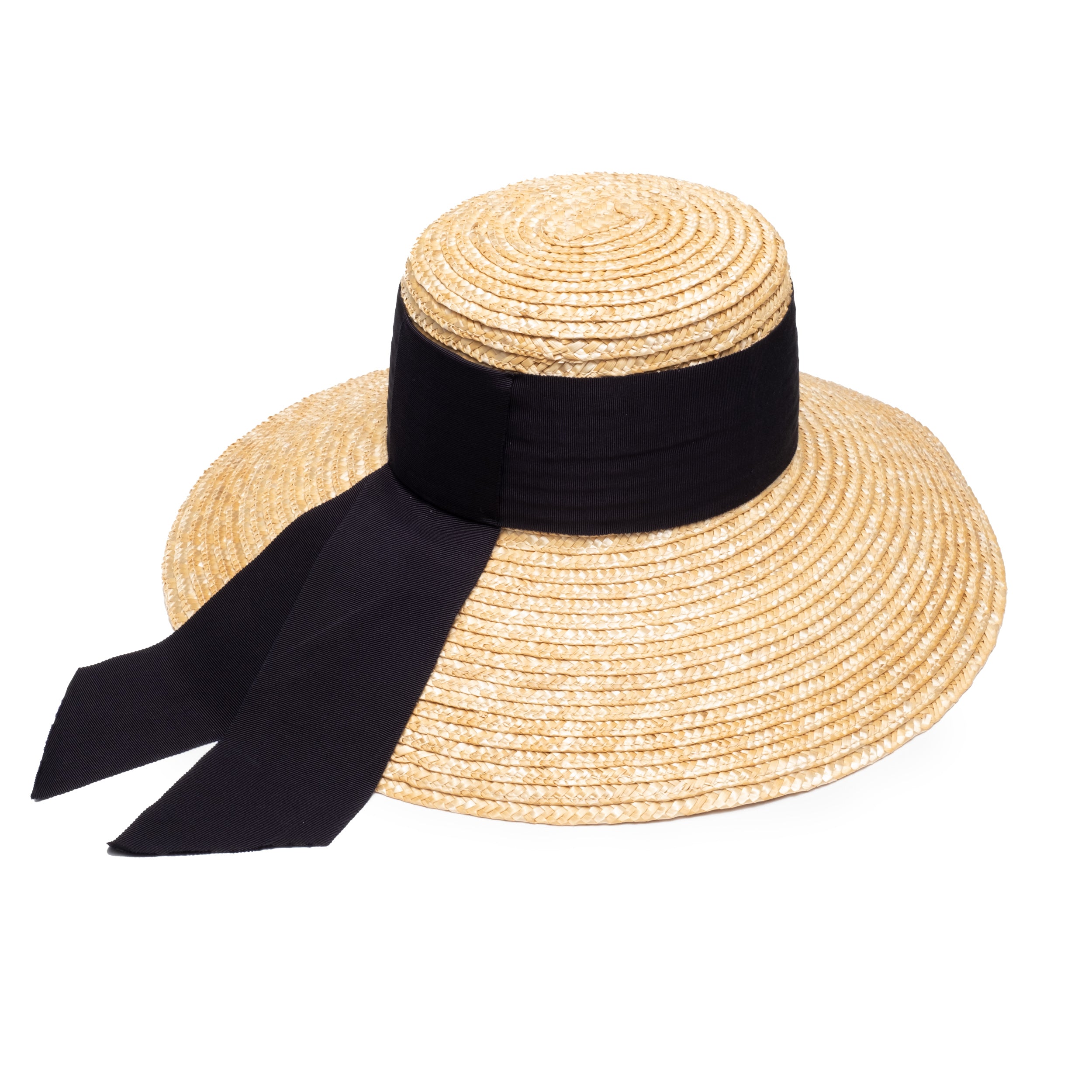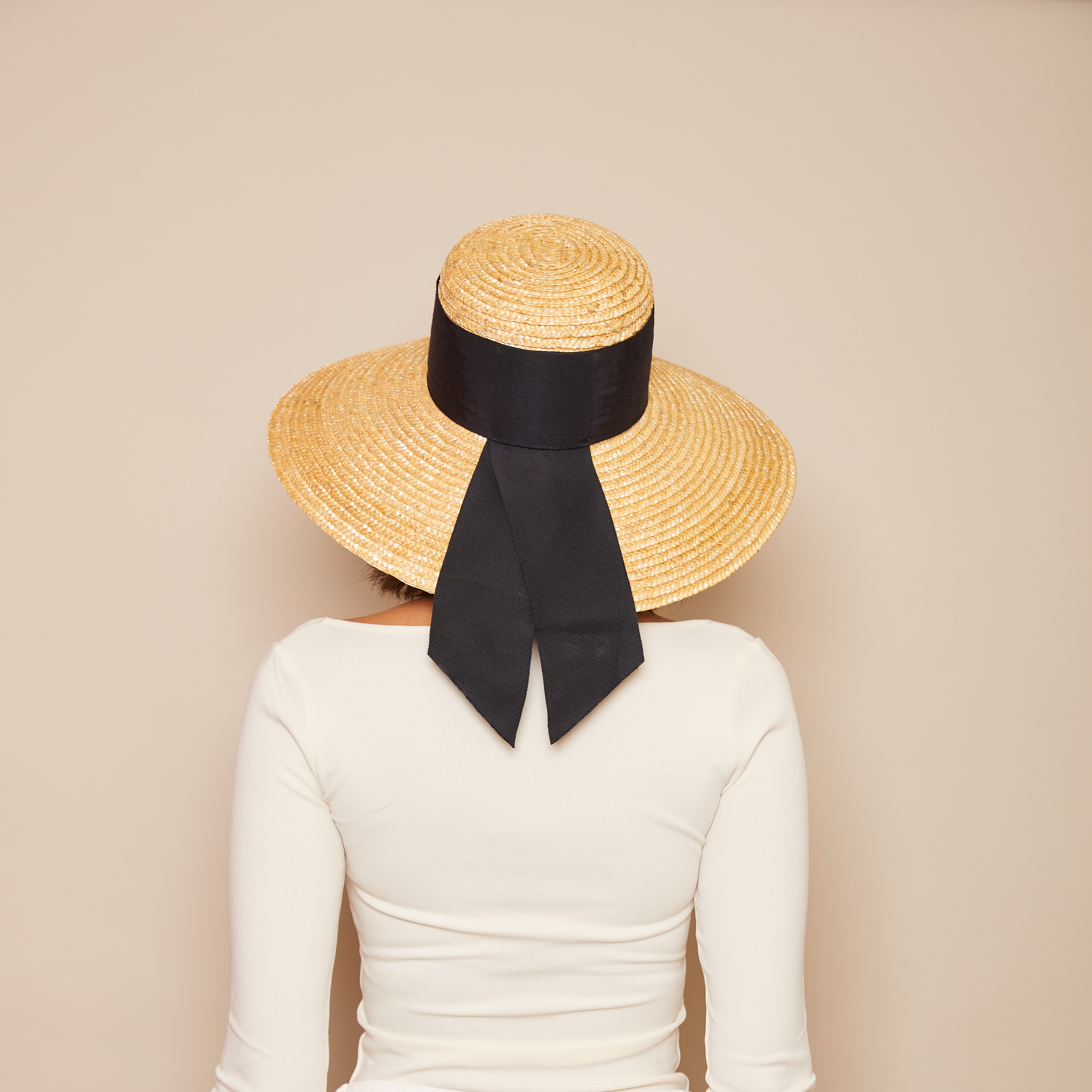 Natural straw wide-brim sunhat with navy grosgrain band and tails. O/S