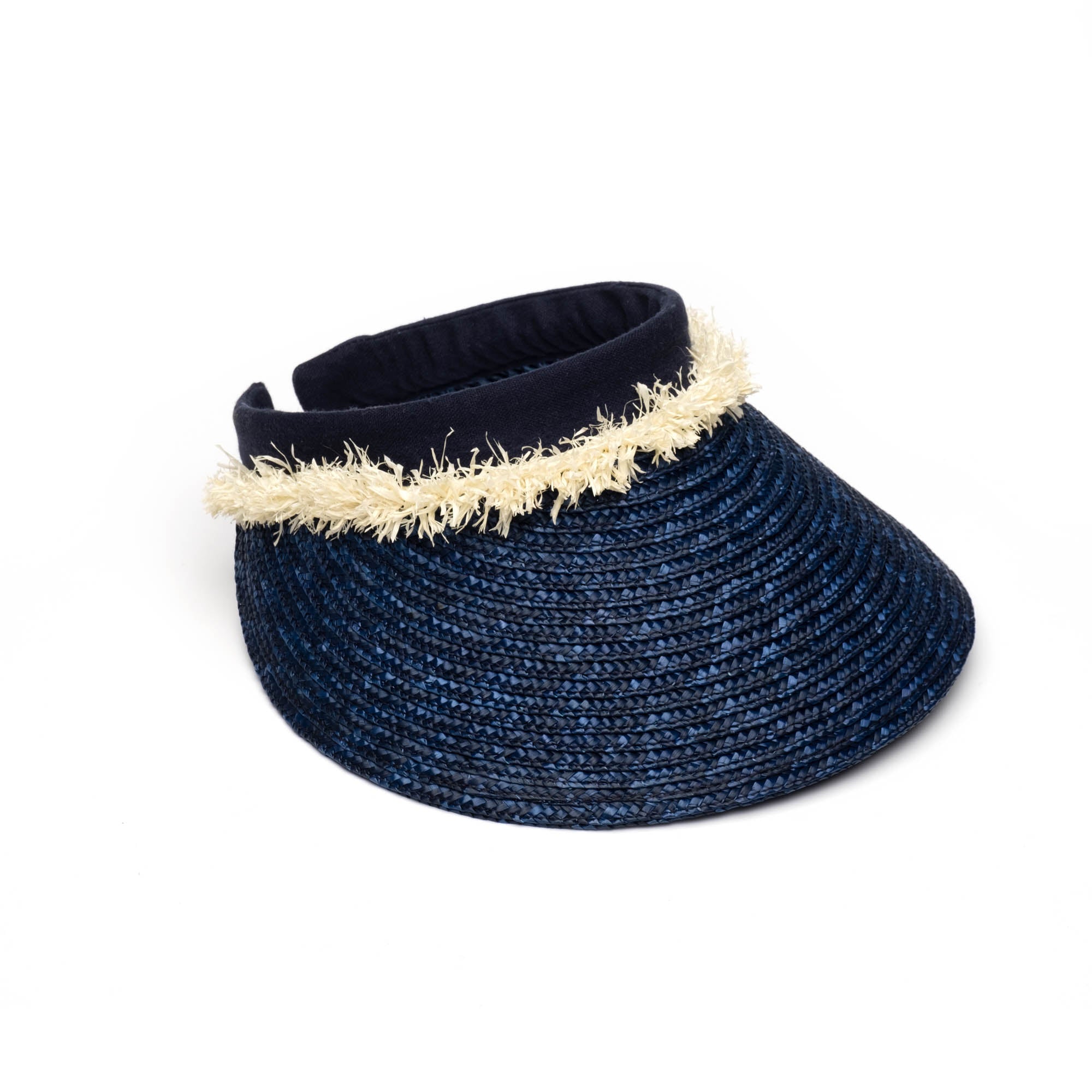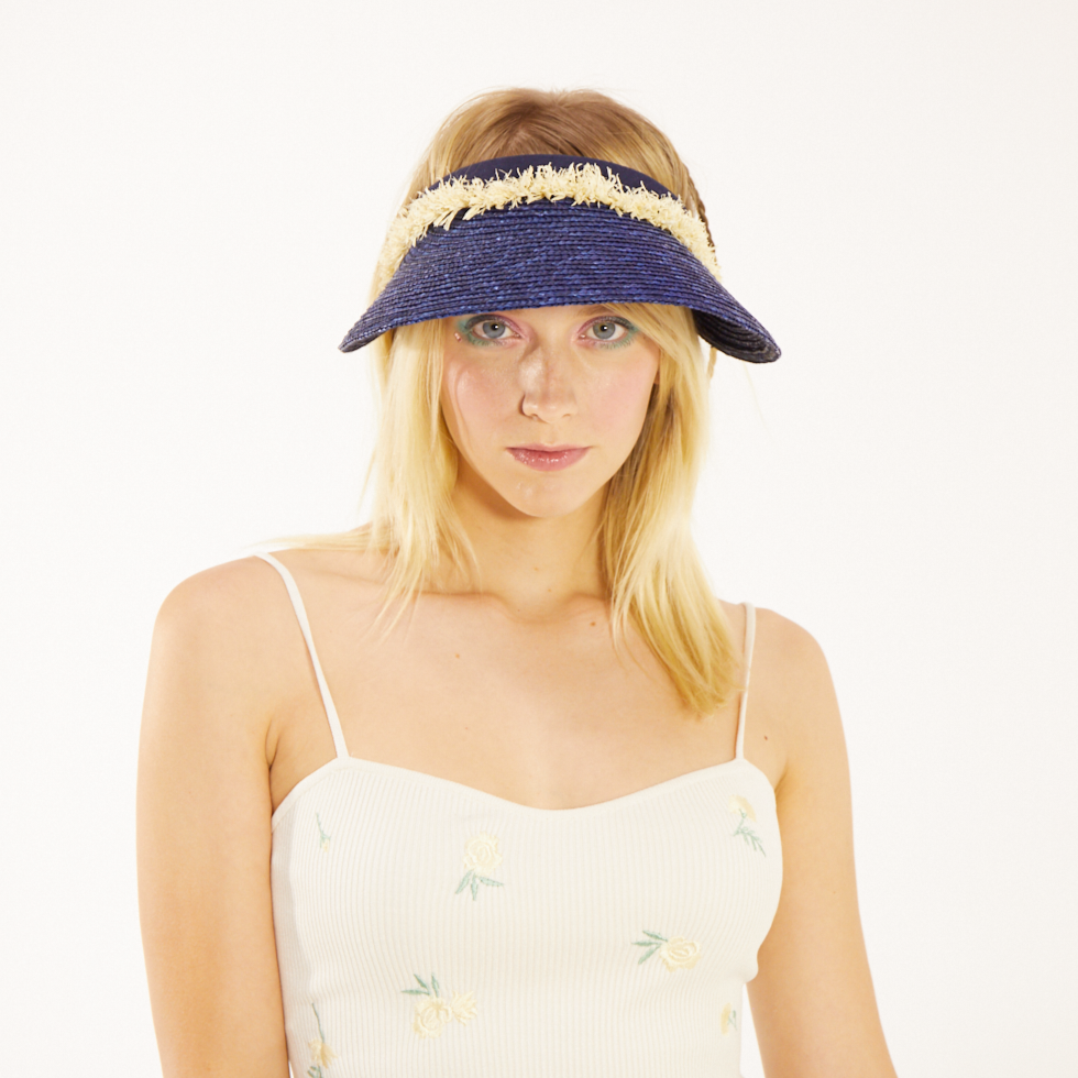 Navy straw visor with navy linen sweatband and ivory frayed trim.