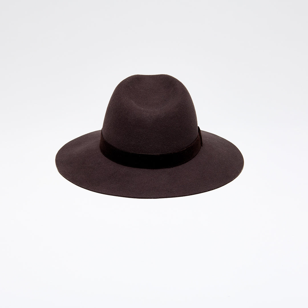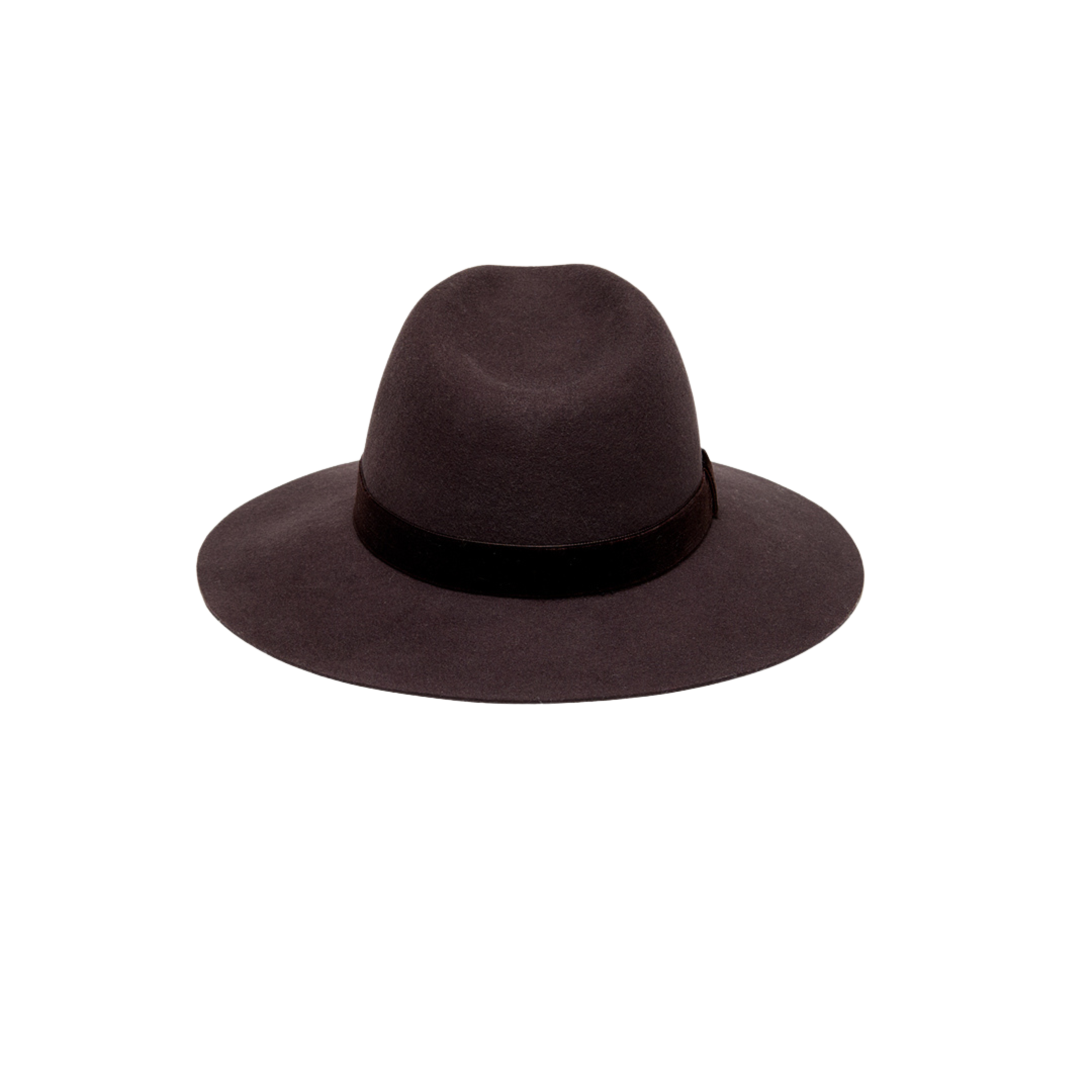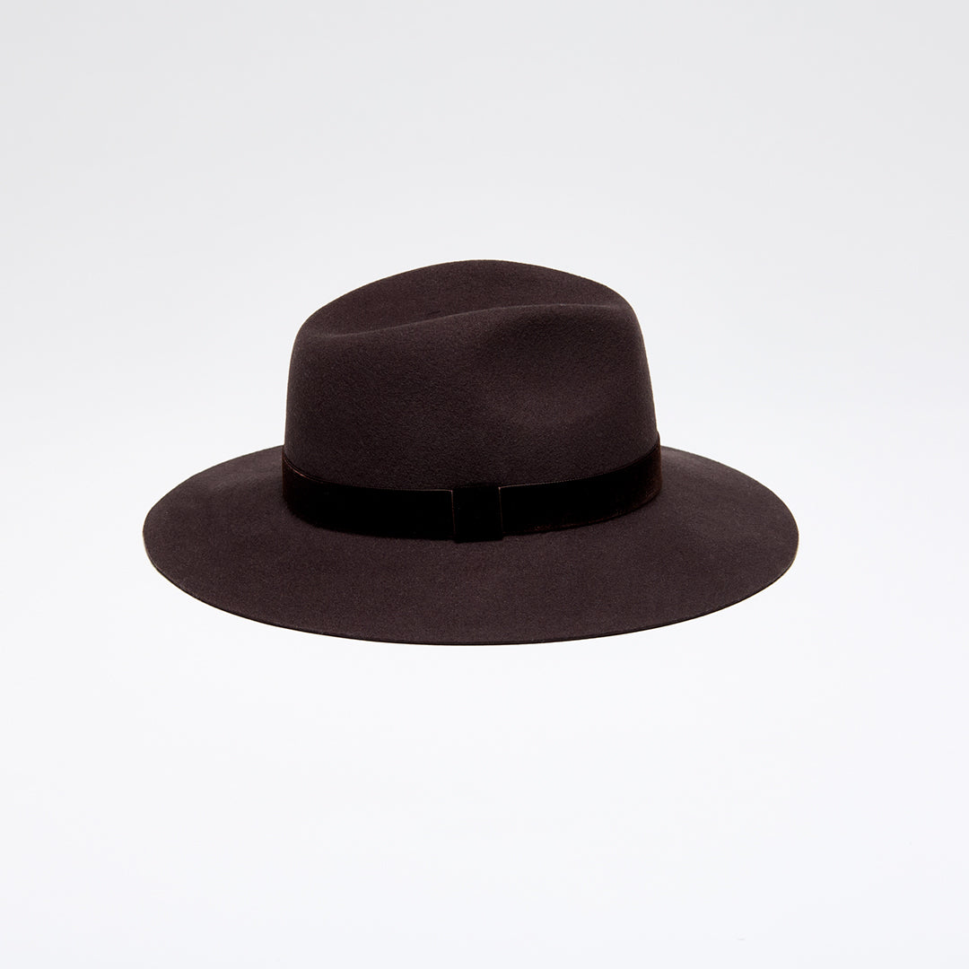 Espresso wool felt fedora with espresso velvet ribbon band.