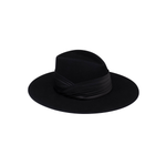 Black wool felt geometric-crown wide-brim fedora with black satin pleated band.