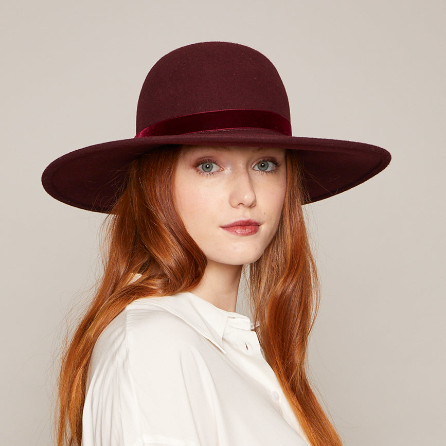 Full of solid sophistication, this wine Honey with tonal velvet band grounds any outfit in a classic, timeless look.