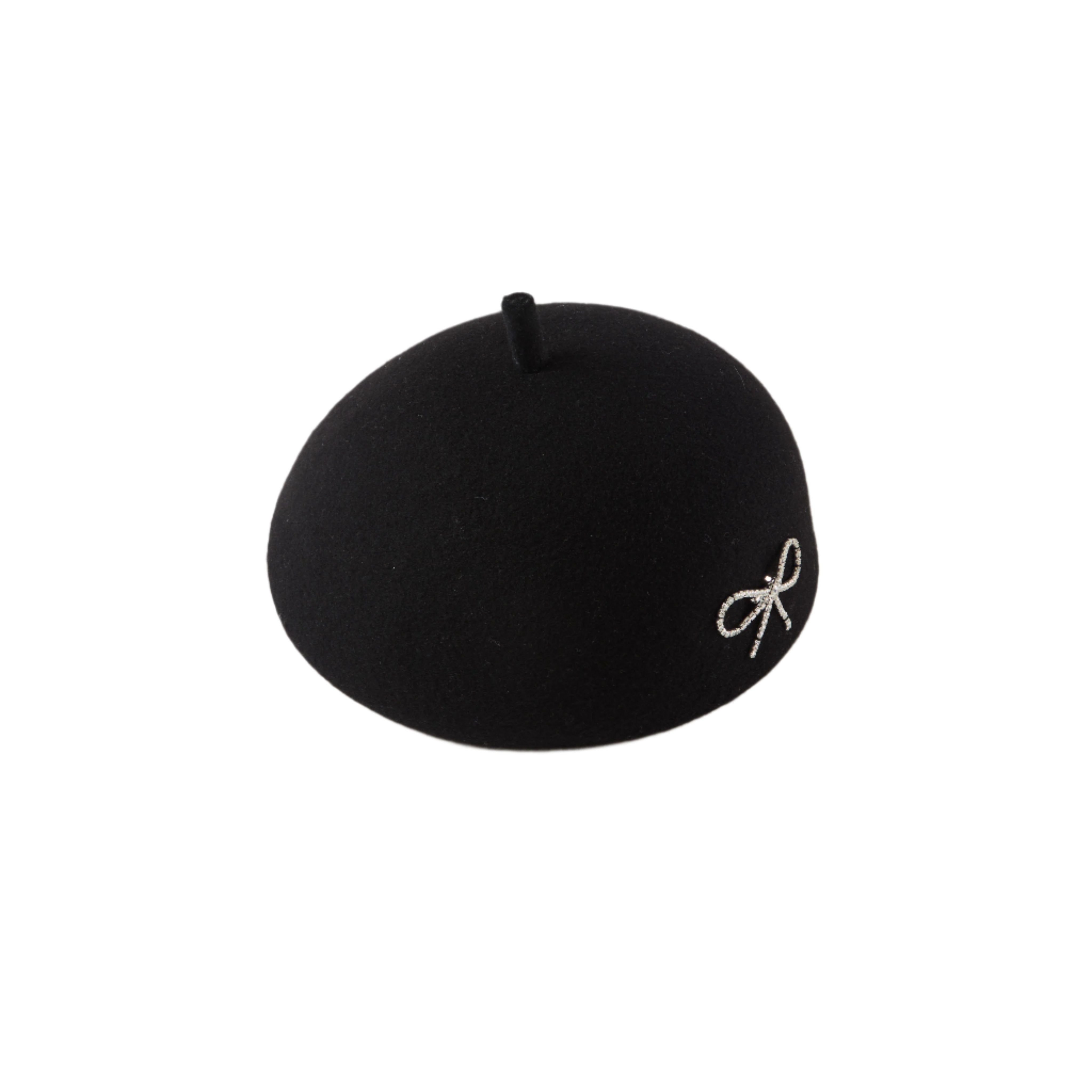 A wool felt beret with stem and crystal bow, now in black and winter white.
