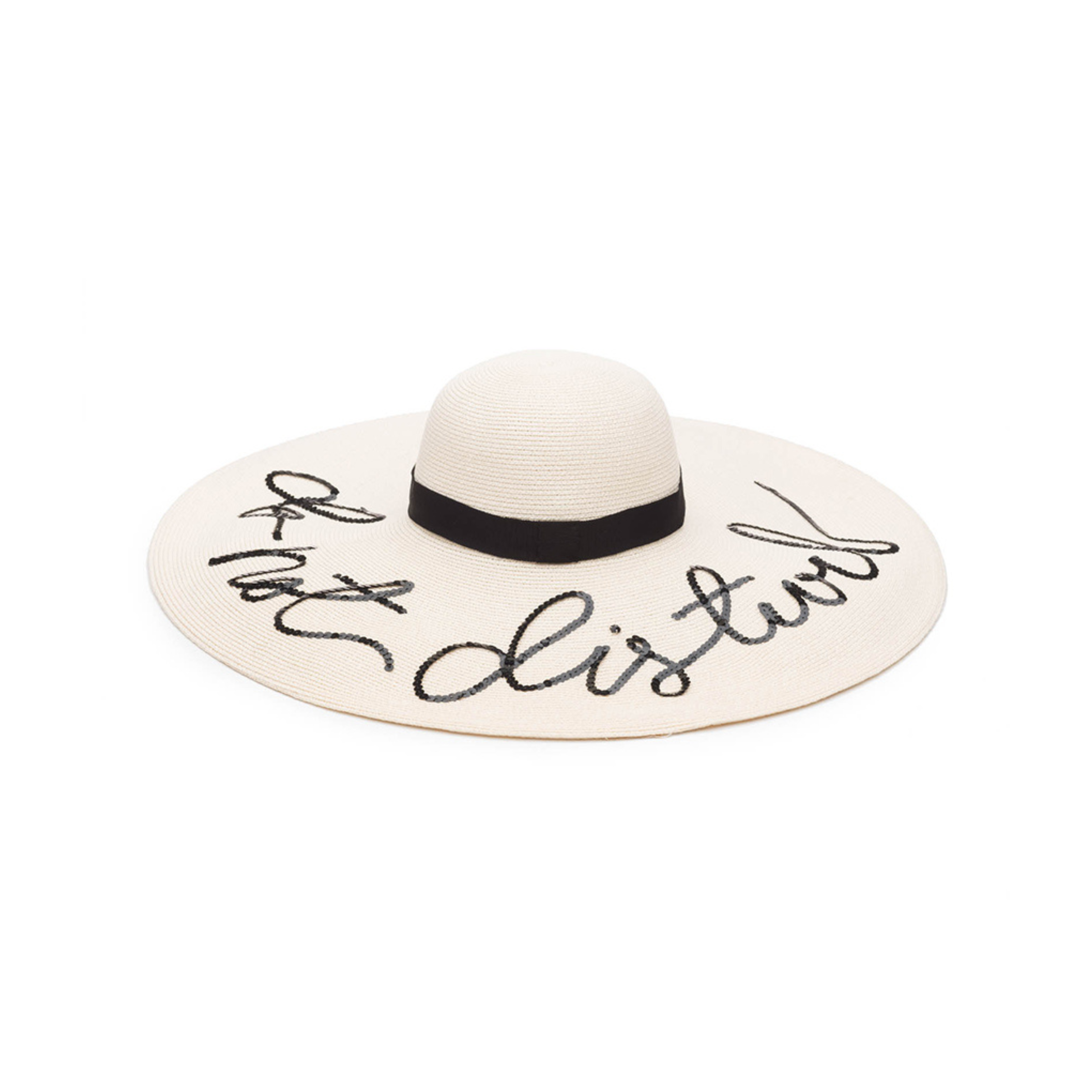 Ivory toyo UPF 30+ protection wide-brim sunhat with black sequin hand-embroidered "do not disturb" and black grosgrain band.