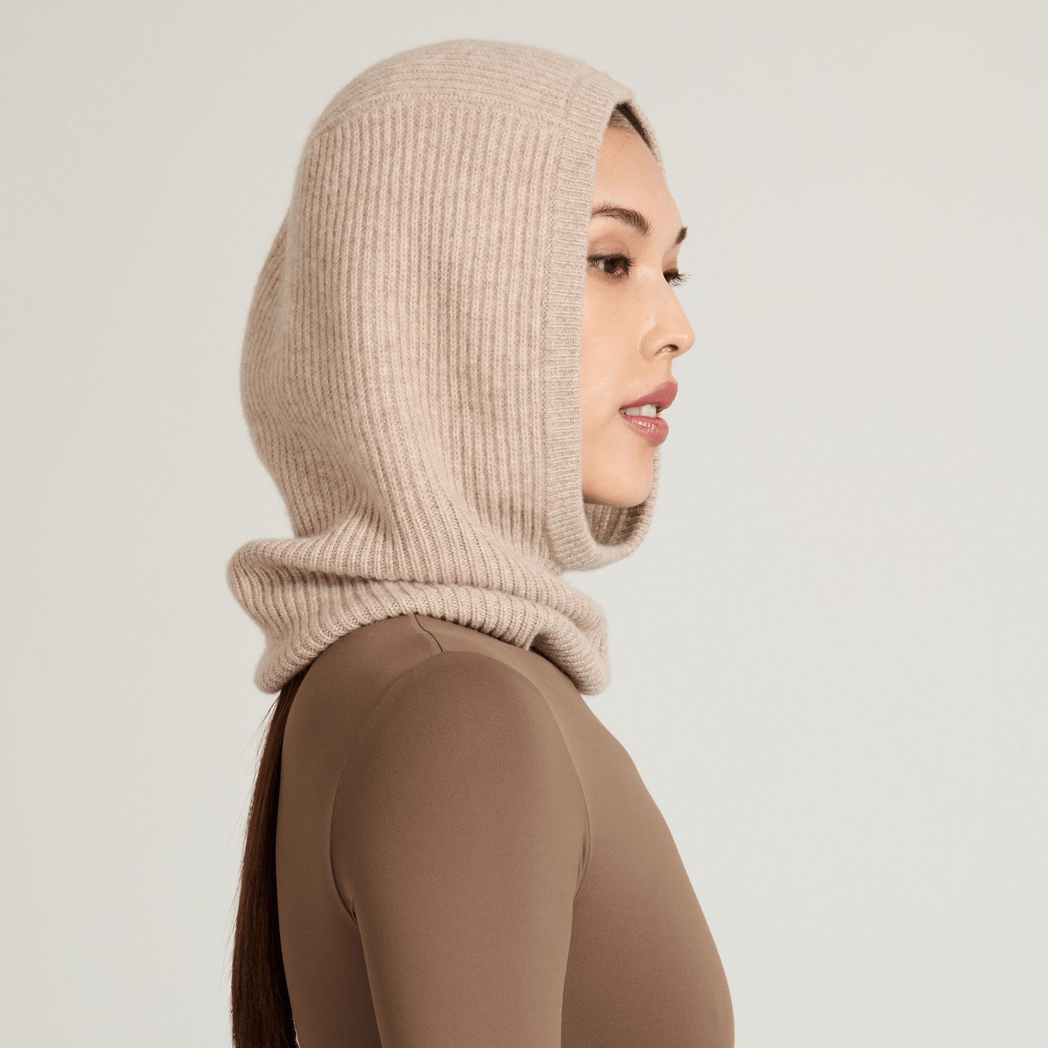 Our black rib-knit Balaclava in cashmere wraps you in warmth and ease. A timeless layer for the season, it moves with you from morning chill to moonlit walks.