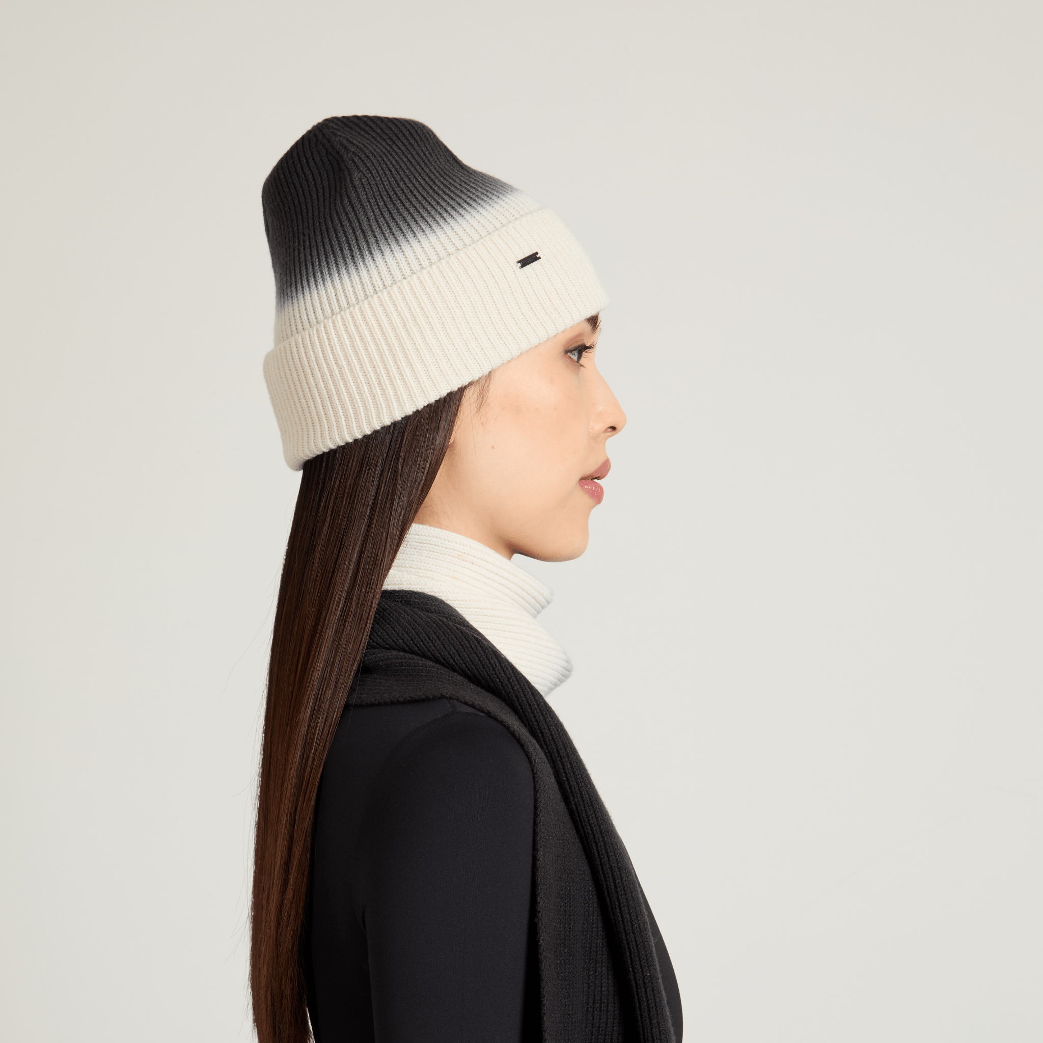 This dip-dye scarf blends ivory and black merino wool in a gentle rib-knit. Made to cocoon you in softness and style as the seasons shift.