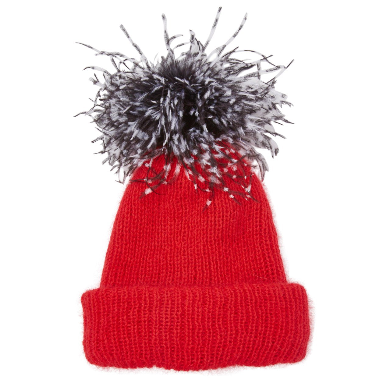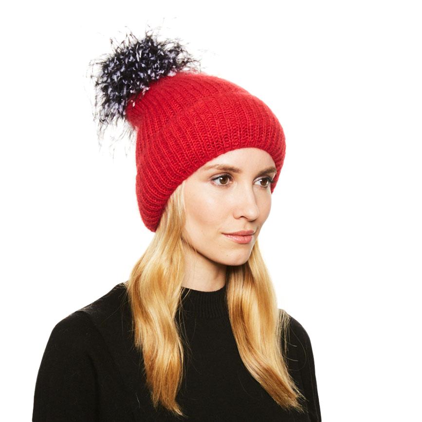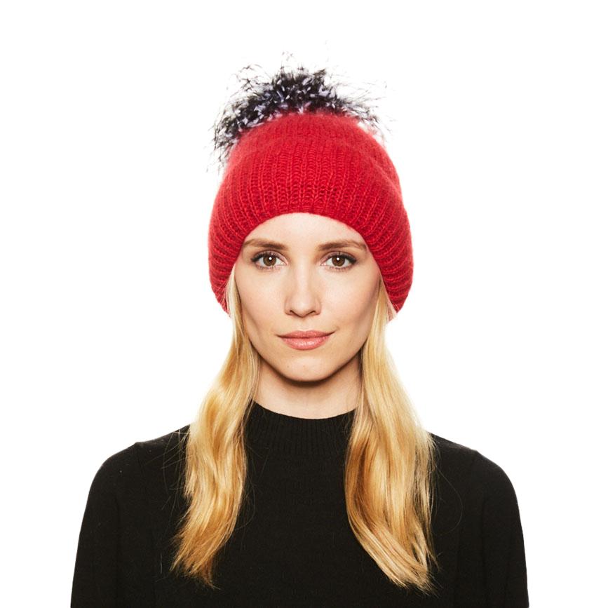 Maddox angora knit beanie in Red with Black/White ostrich pom