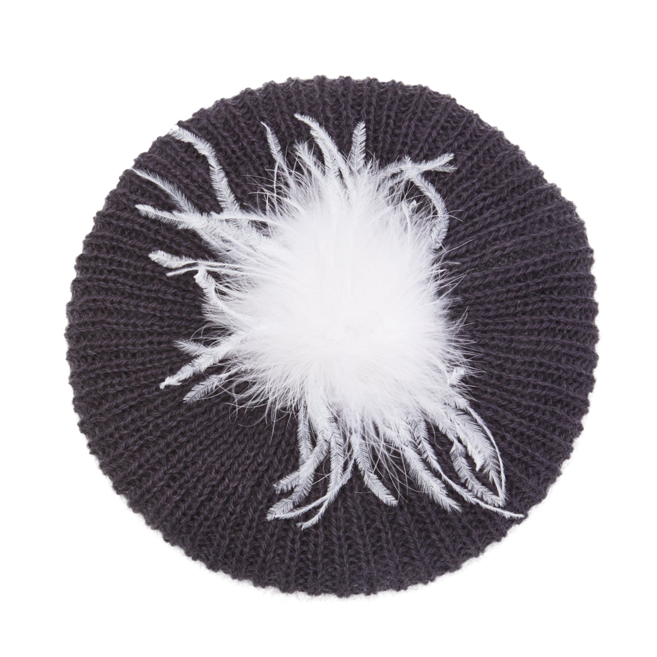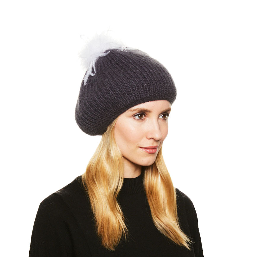 The Rochelle, our best-selling cold-weather beret is back in a classic Charcoal angora knit, finished with a whimsical Winter White ostrich feather pom.