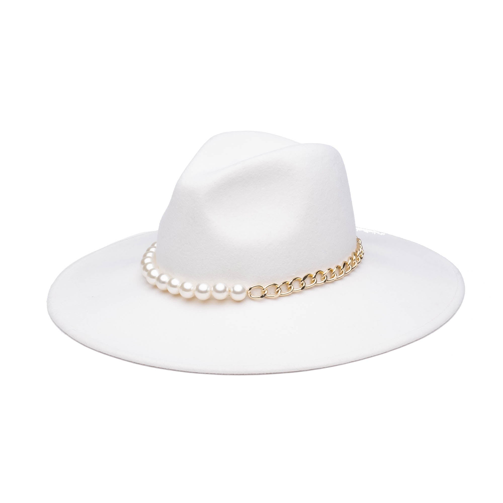 Winter white wool felt wide-brim fedora with pearl/gold chain trim.