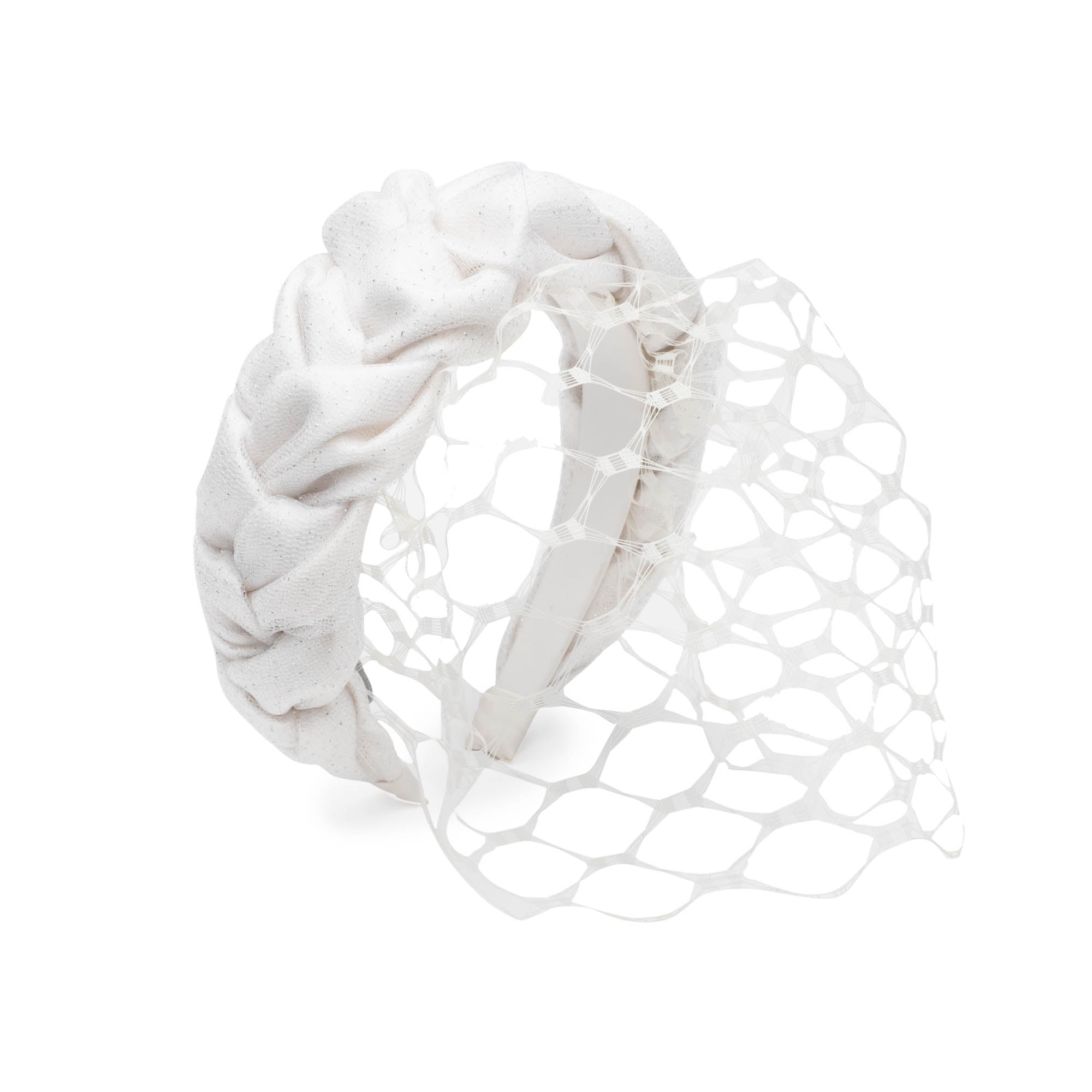 The Grace features a netted birdcage veil attached to an oversized tulle braid that creates a memorable, geometric look.