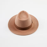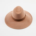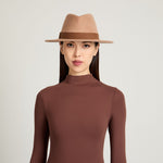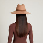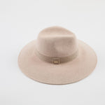 A study in quiet luxury, the Emmanuelle Fedora pairs bone mélange brushed wool felt with an oatmeal cashmere ribbon for a look that’s serene yet striking. Finished with a 14KT gold logo plate, it’s elegance distilled.