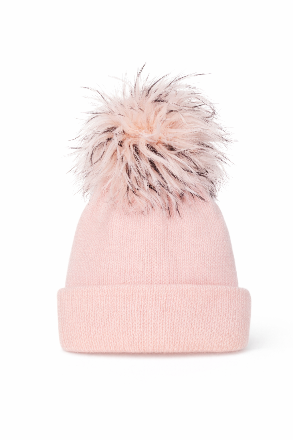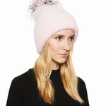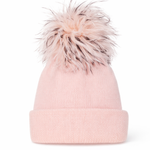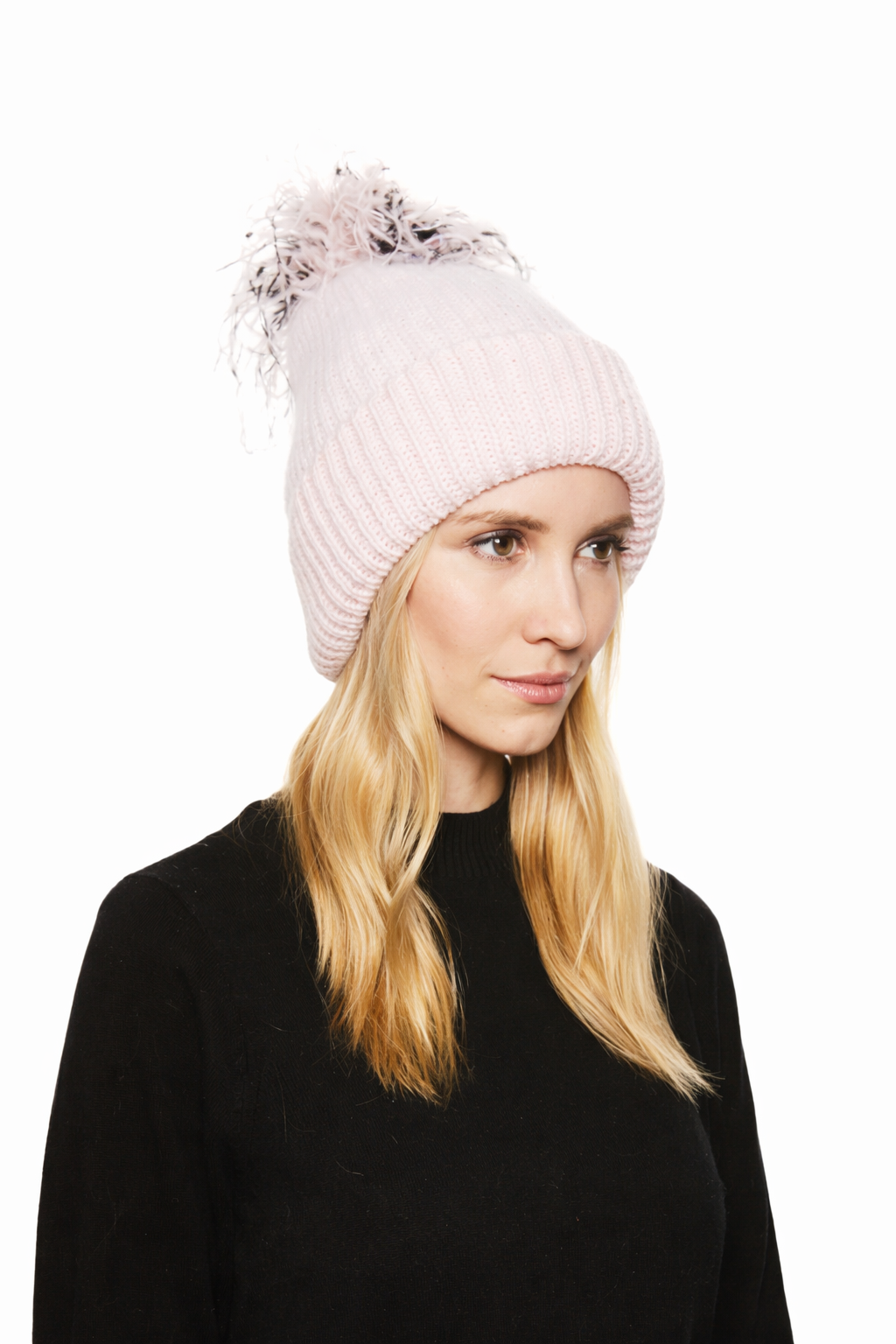 Maddox angora knit beanie in Pale Pink with Blush/Black/White ostrich pom