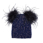 A hand-knit beanie crafted from rich navy chunky wool, interwoven with gray silk chiffon and rose-gold metallic yarn for subtle contrast and shine. Finished with plush white ostrich feather pom-poms, this elevated cold-weather essential balances warmth with refined texture.