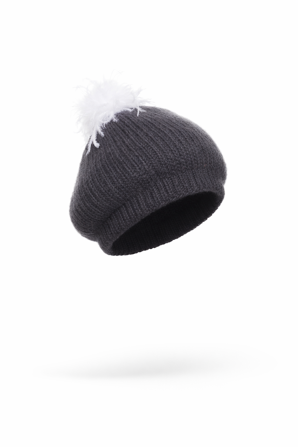 The Rochelle, our best-selling cold-weather beret is back in a classic Charcoal angora knit, finished with a whimsical Winter White ostrich feather pom.