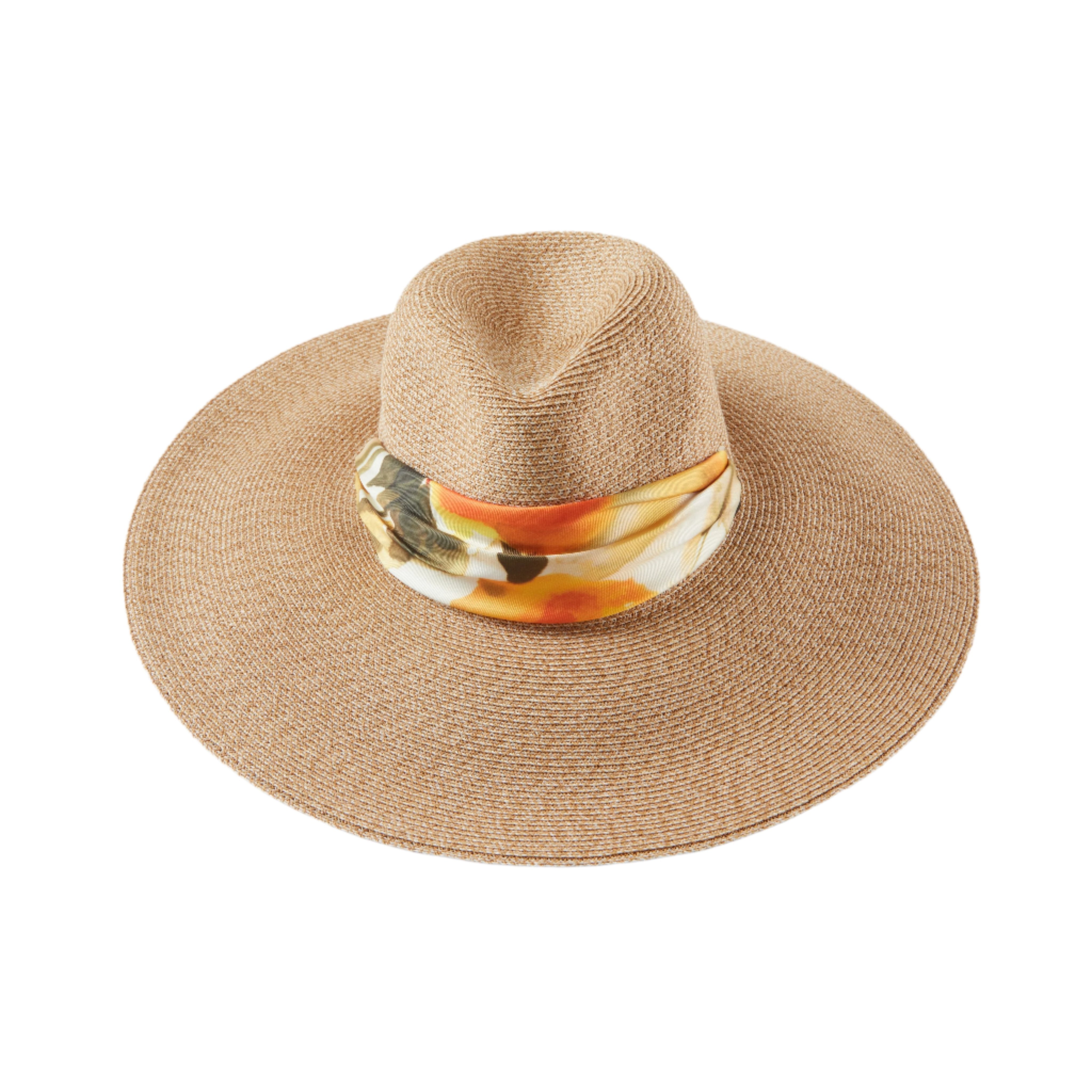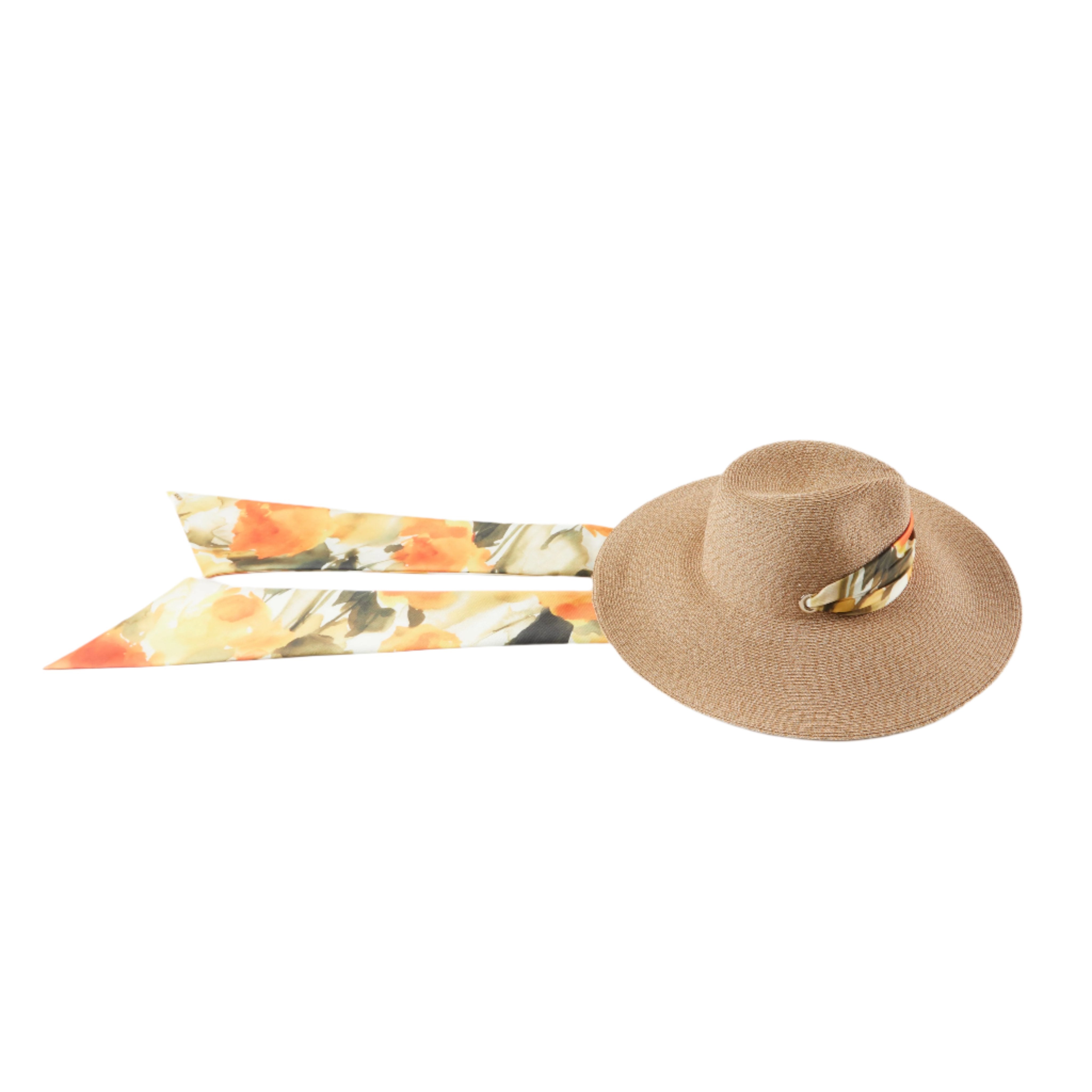 Sand toyo UPF 25+ protection packable wide-brim fedora with 14KT gold grommets and orange floral-print satin pull-through scarf tipped with a 14KT gold logo plate.