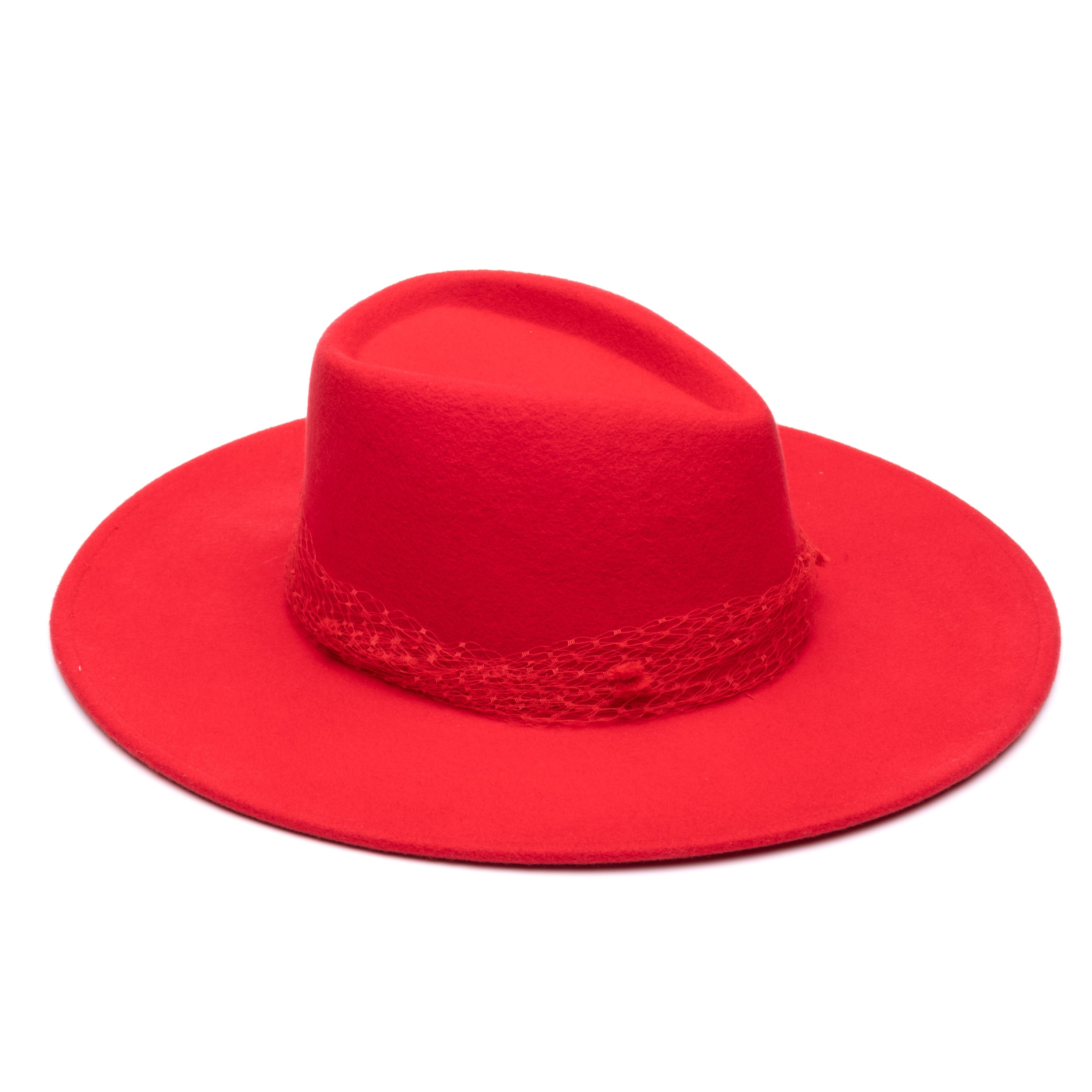 Red wool felt geometric-crown wide-brim fedora with birdcage veil band.