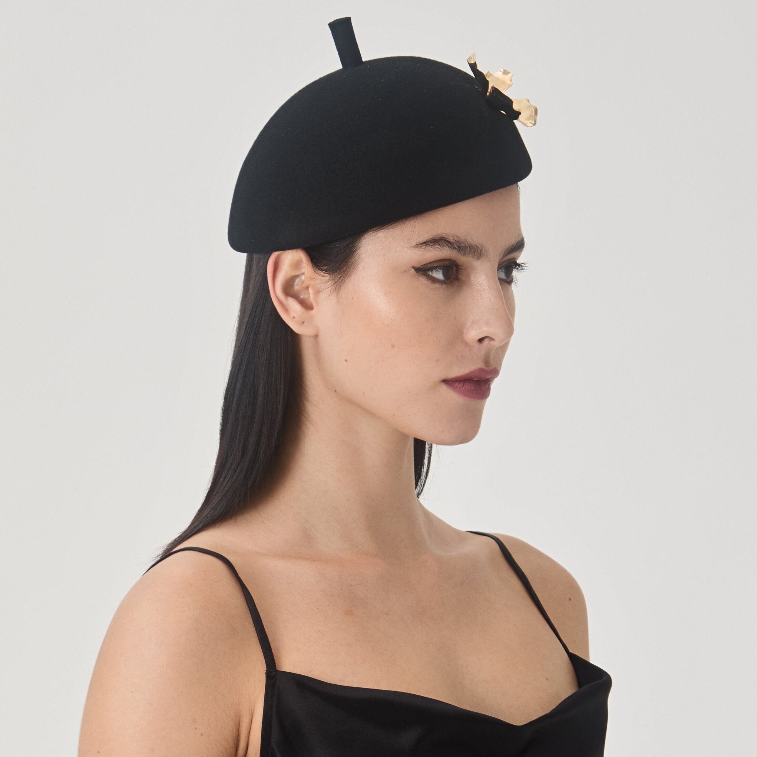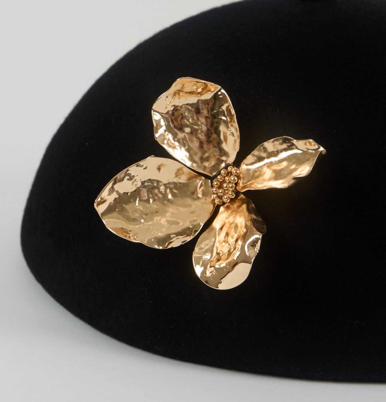 The Coco Beret is crafted in soft black wool felt and finished with a sculptural gold-tone abstract flower — a study in minimalism and quiet glamour. Designed to frame the face beautifully, it brings instant sophistication to any look.