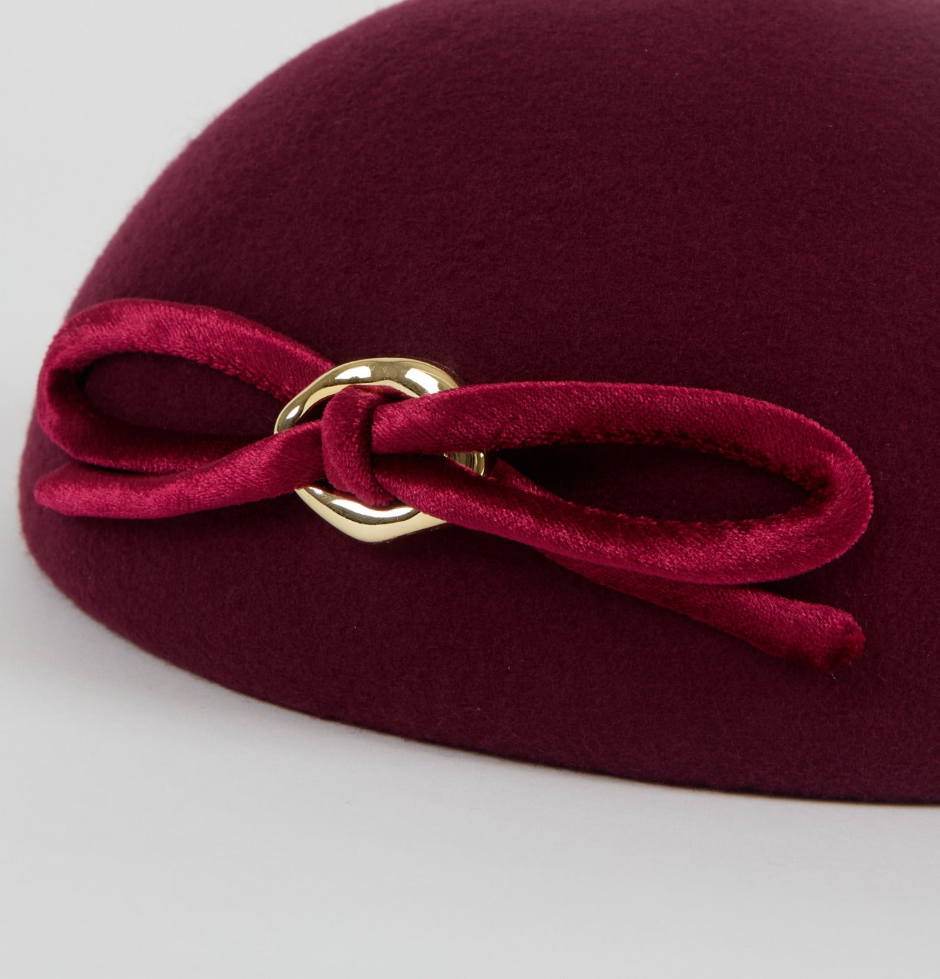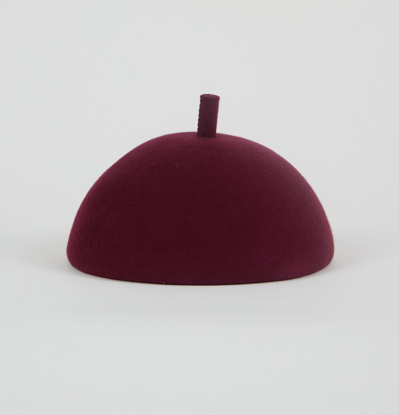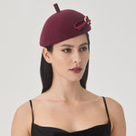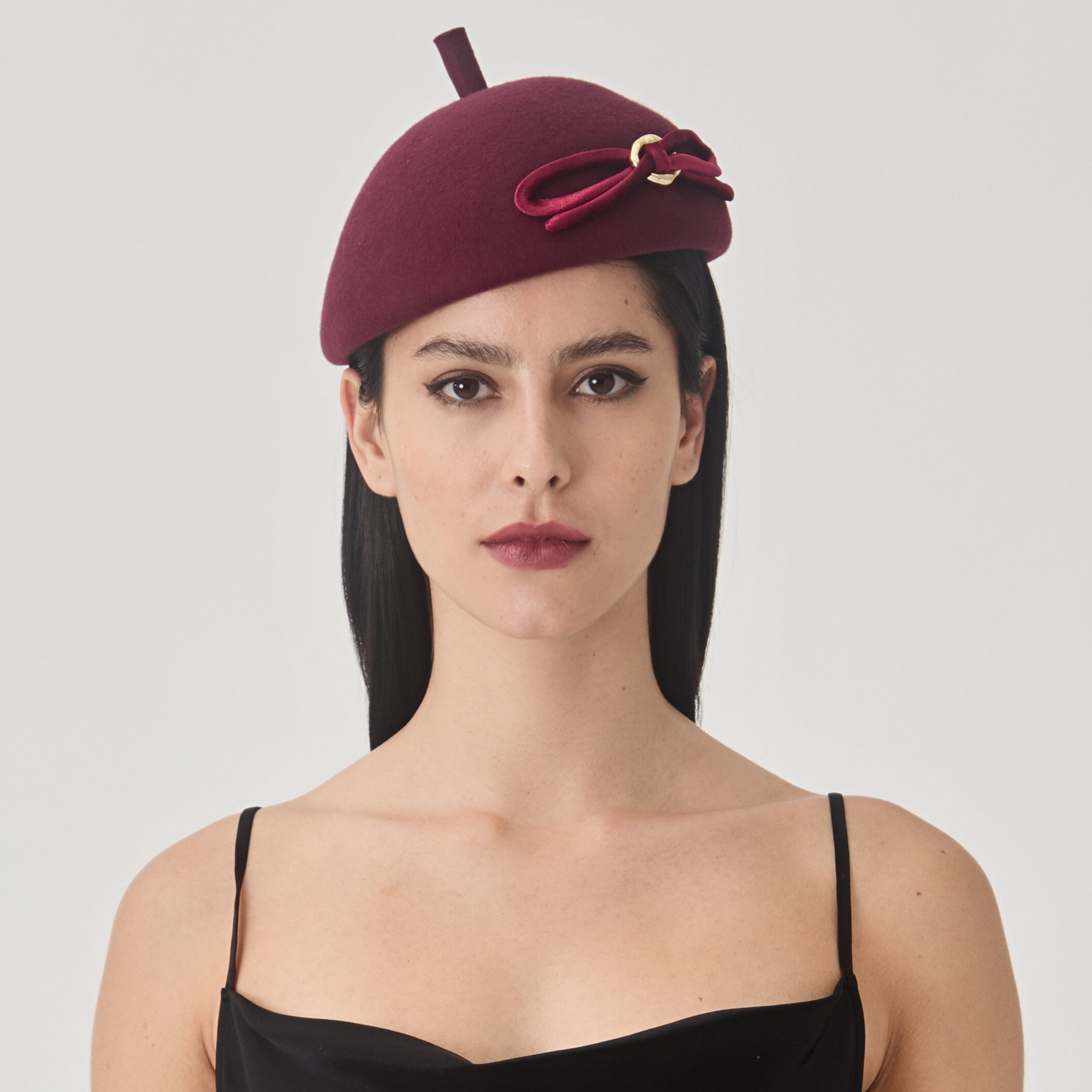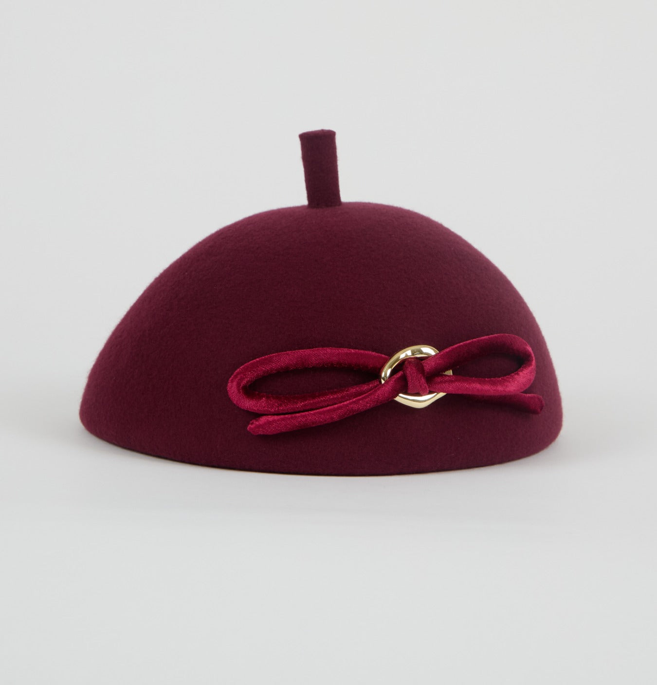 The Bordeaux Beret is crafted from rich bordeaux wool felt and finished with a plush velvet bow in a matching tone. Its sculptural silhouette and monochromatic texture create a modern expression of timeless femininity — elegant, understated, and undeniably classic.