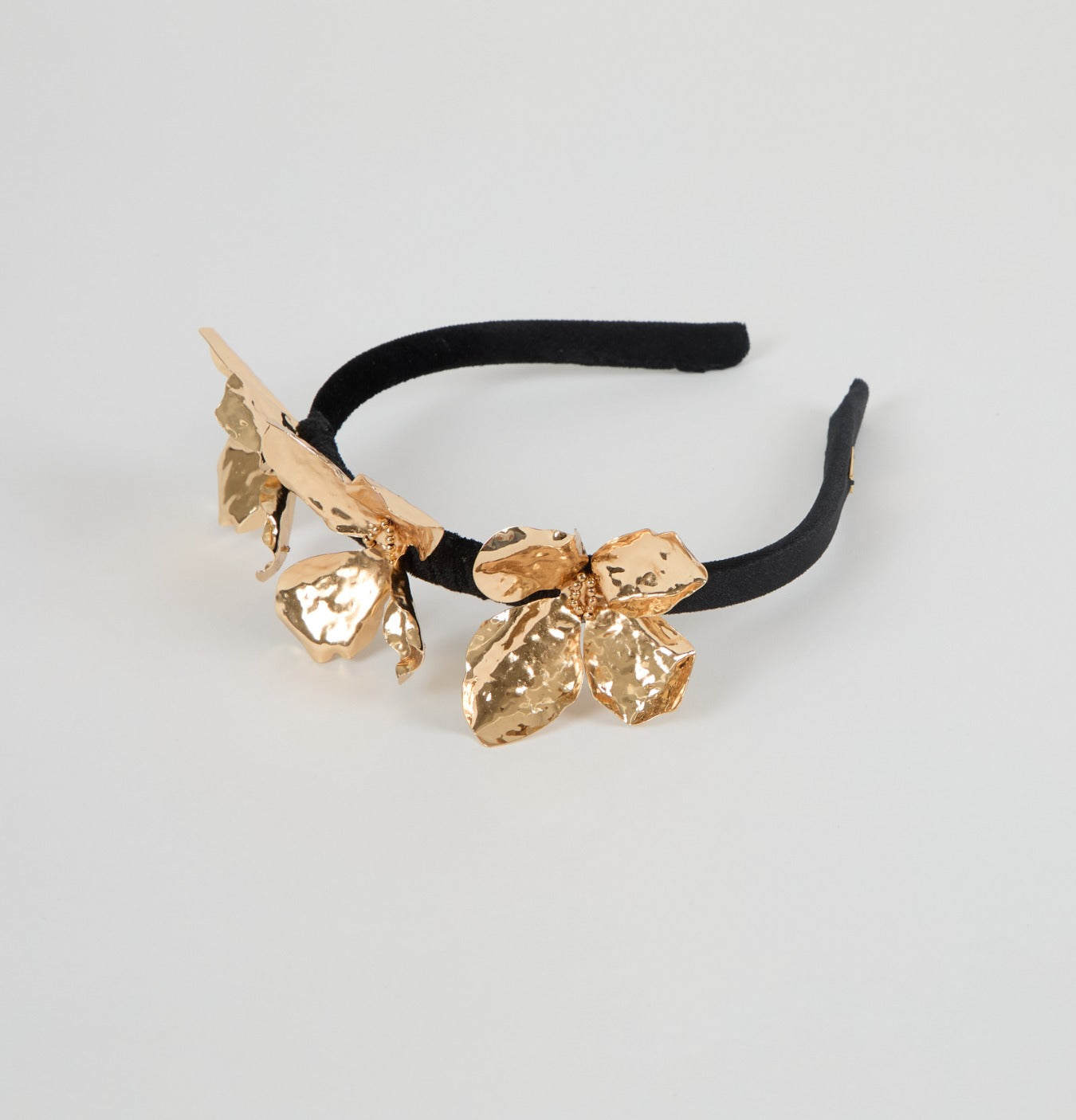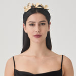 The Frida Headband is crafted from lustrous black panné velvet and embellished with gilded floral accents and polished metallic detailing. Designed to catch the light with every movement, it channels the quiet power and allure of Old Hollywood elegance.