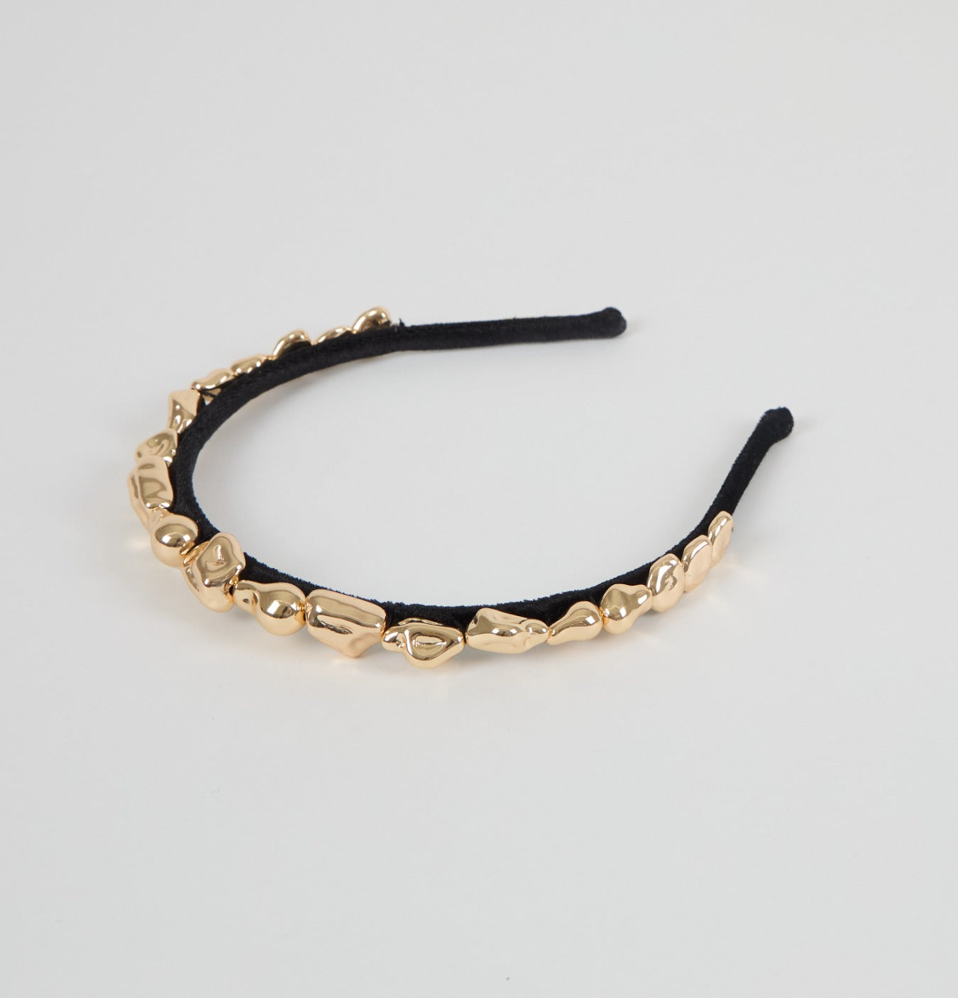 The Nova Headband is handcrafted from rich black panné velvet and adorned with sculptural gold-tone stones and metallic beads that shimmer like starlight. A luminous statement of understated power and poise.