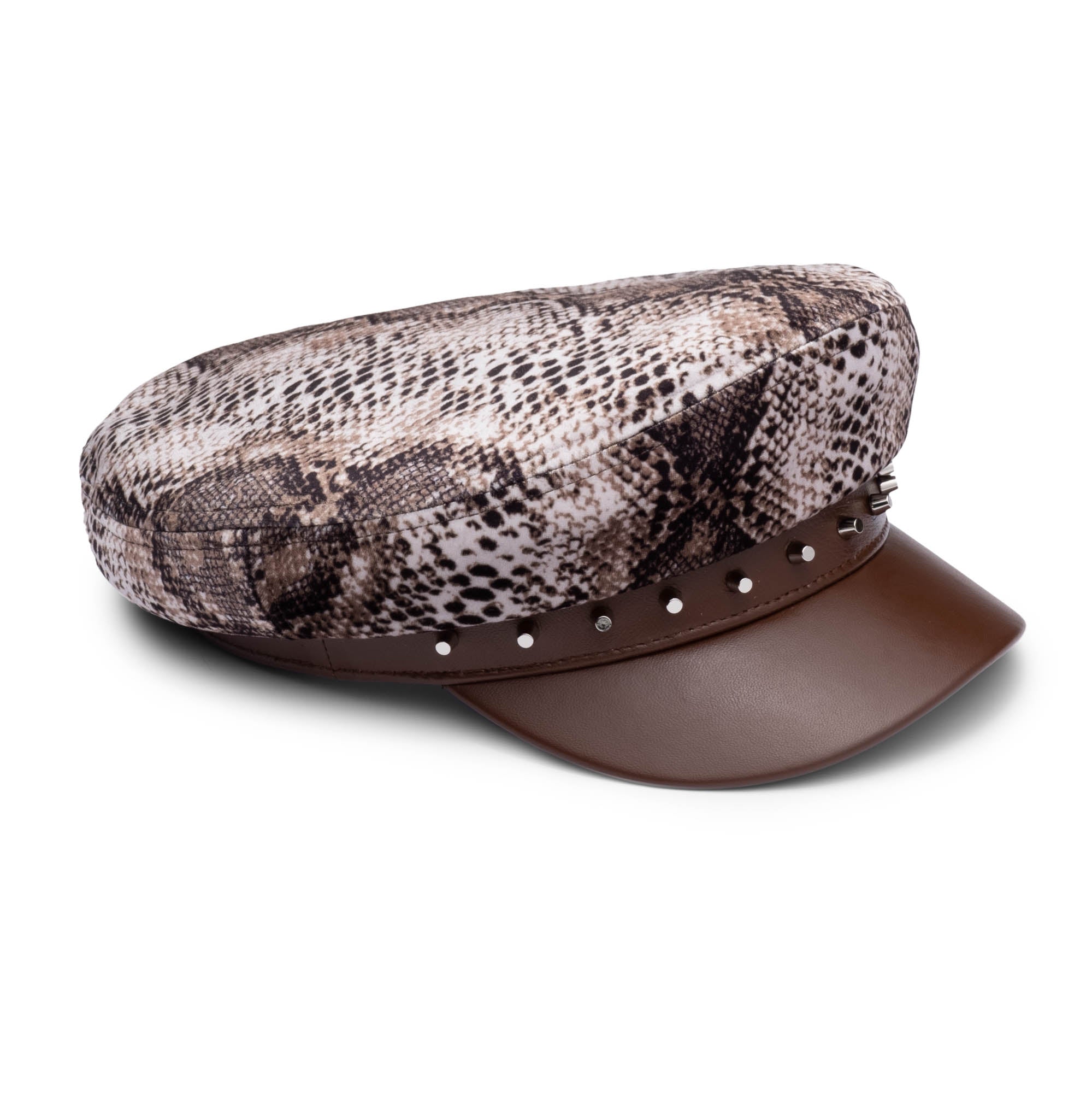 Ivory/brown snake-print velvet cap with brown leather bill and silver studs.