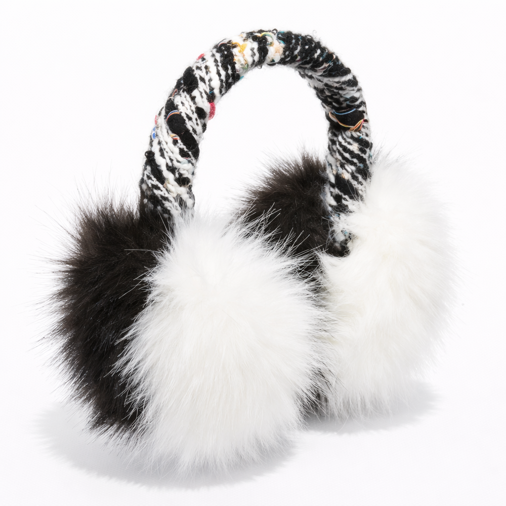 Crafted in black and white faux fur, it features a black and multicolored tweed-wrapped band and plush padded earpieces for added comfort and warmth.