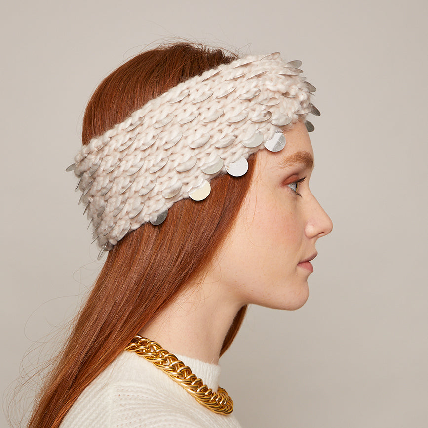 Off-white knit turban headband with silver paillettes.