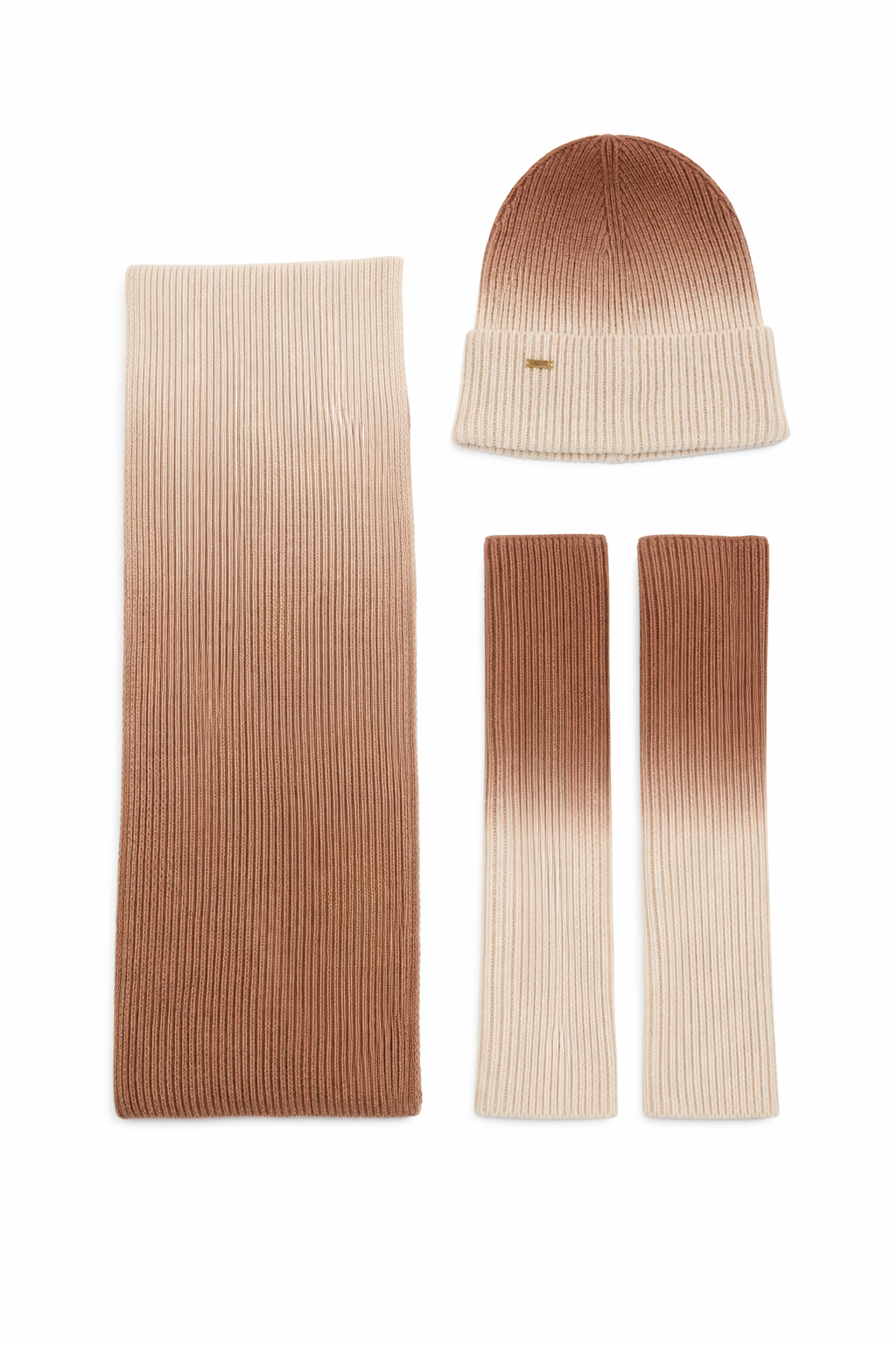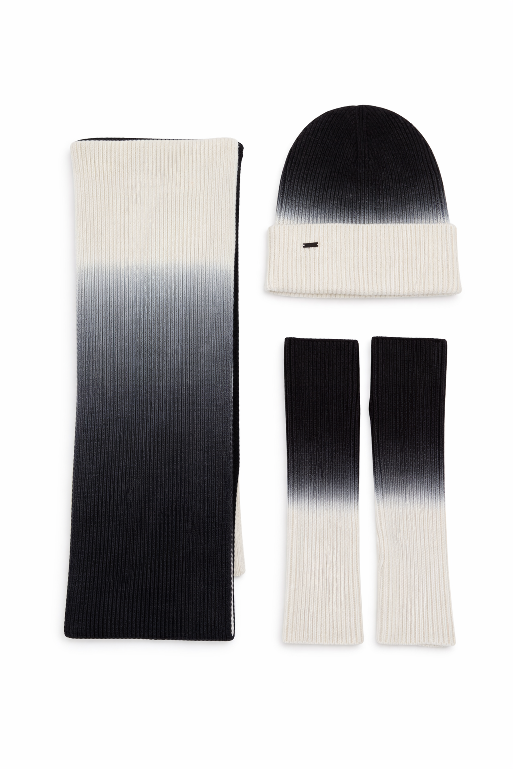 This dip-dye scarf blends ivory and black merino wool in a gentle rib-knit. Made to cocoon you in softness and style as the seasons shift.