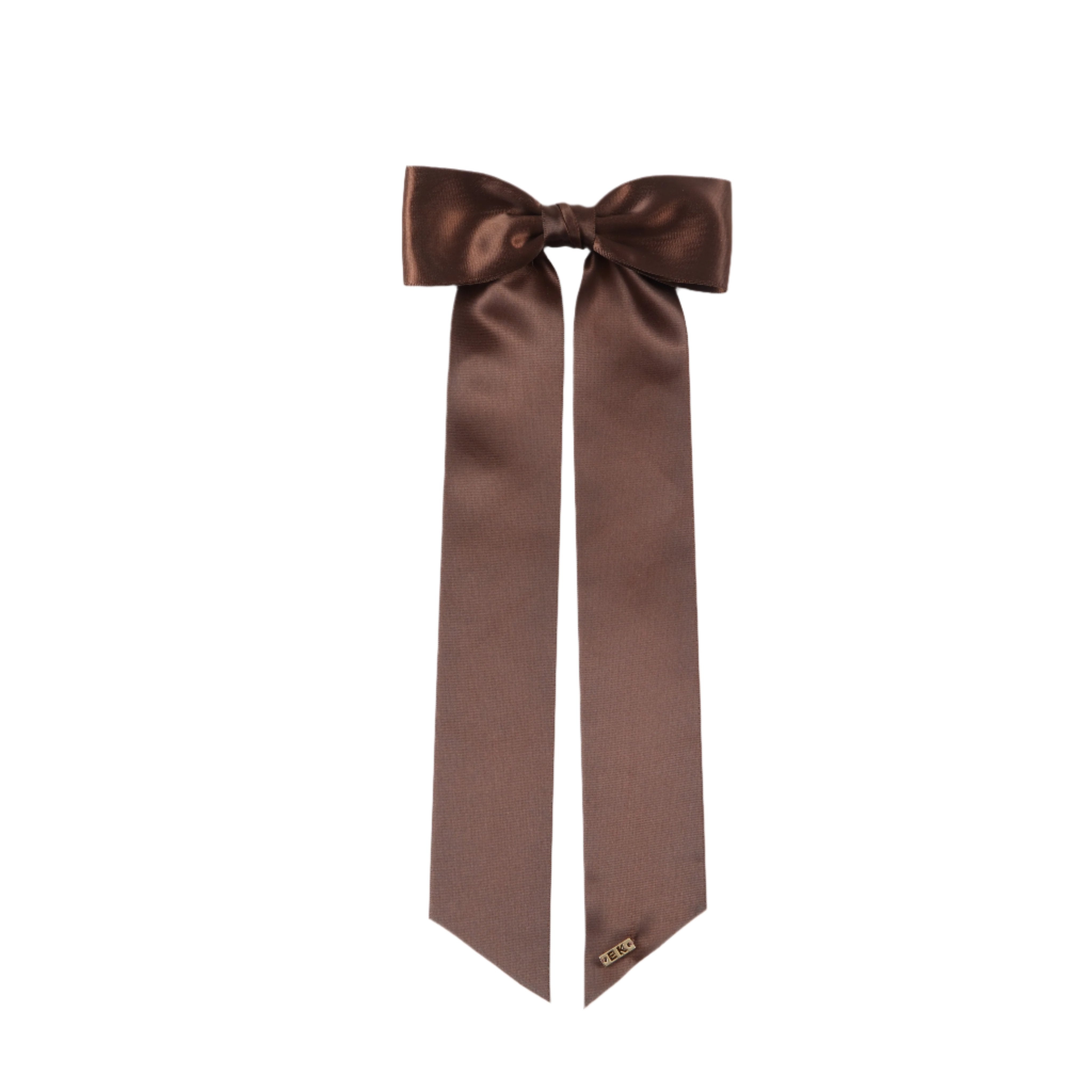 Chocolate satin ribbon bow barette with 14KT gold logo plate-tipped tails.