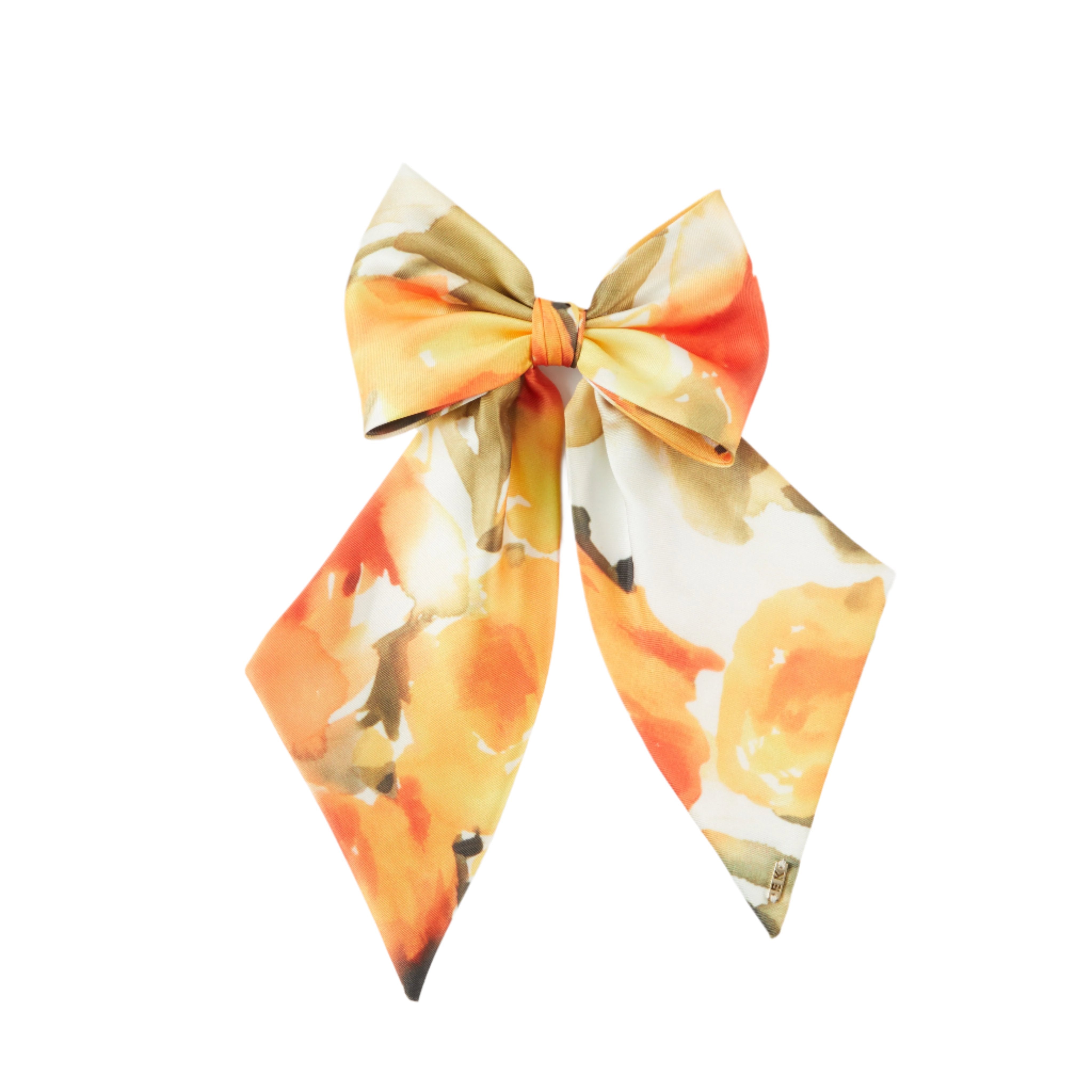 Orange floral-print satin bow barrette with 14KT gold logo plate-tipped tails.