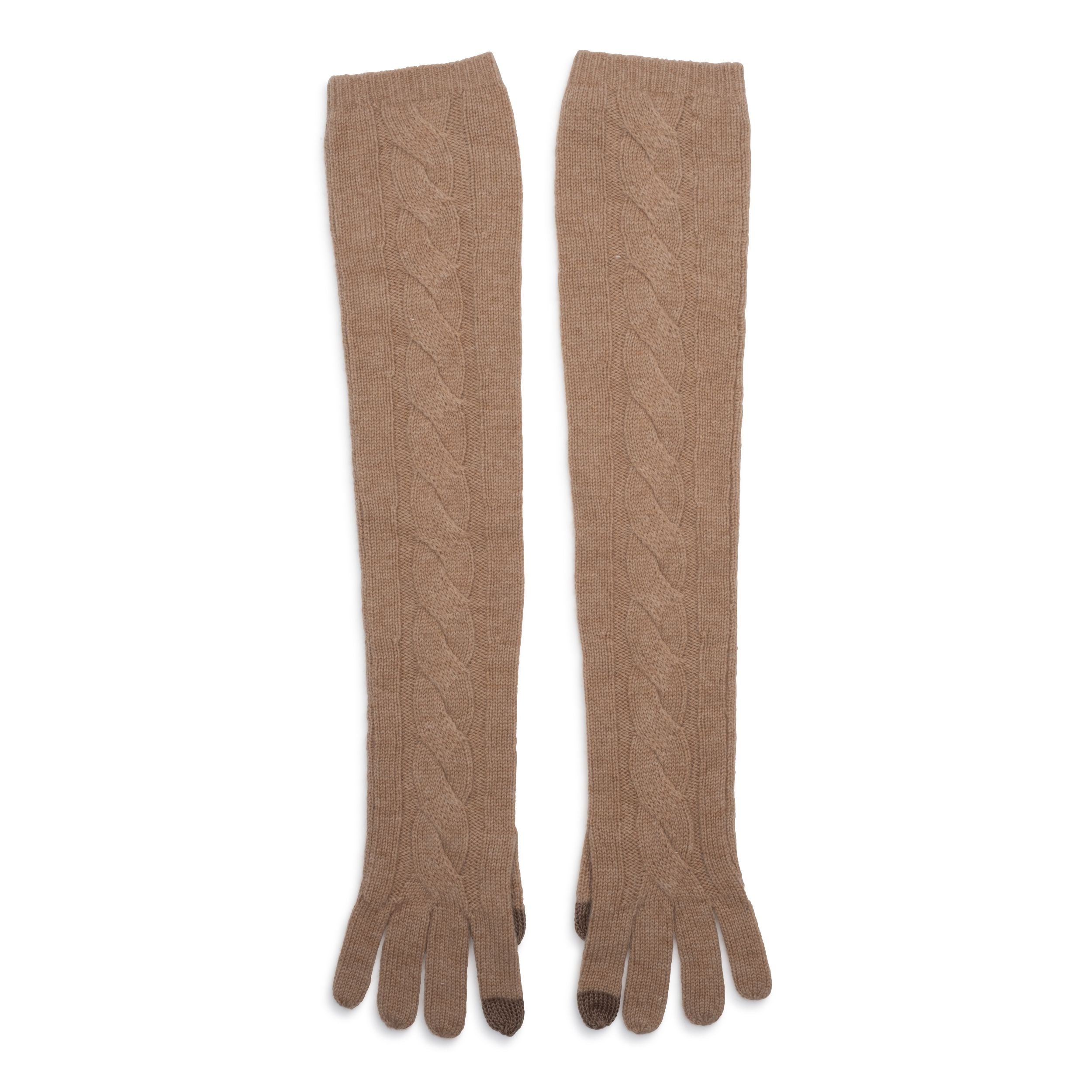 Camel cabled cashmere-blend knit gloves with texting fingers.
