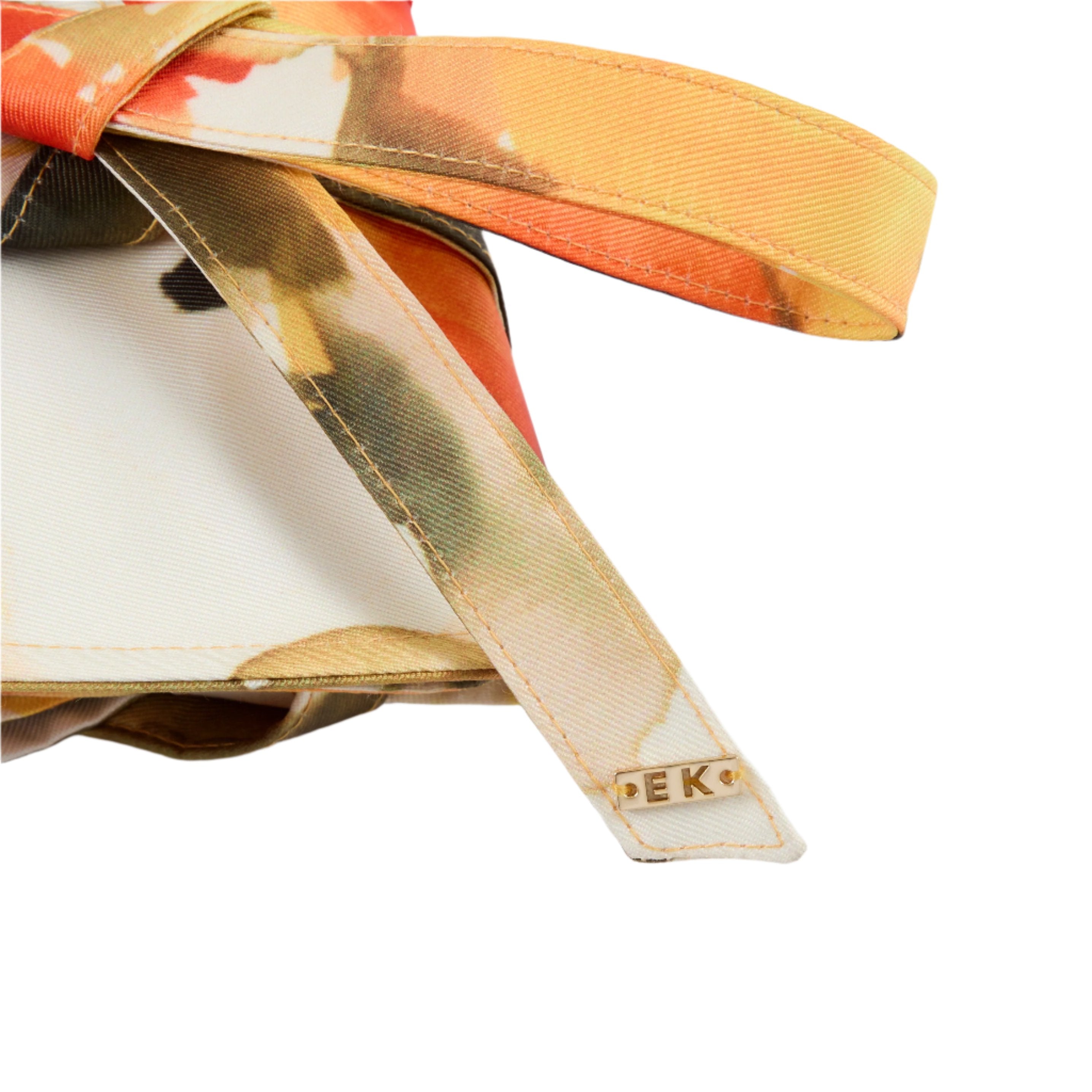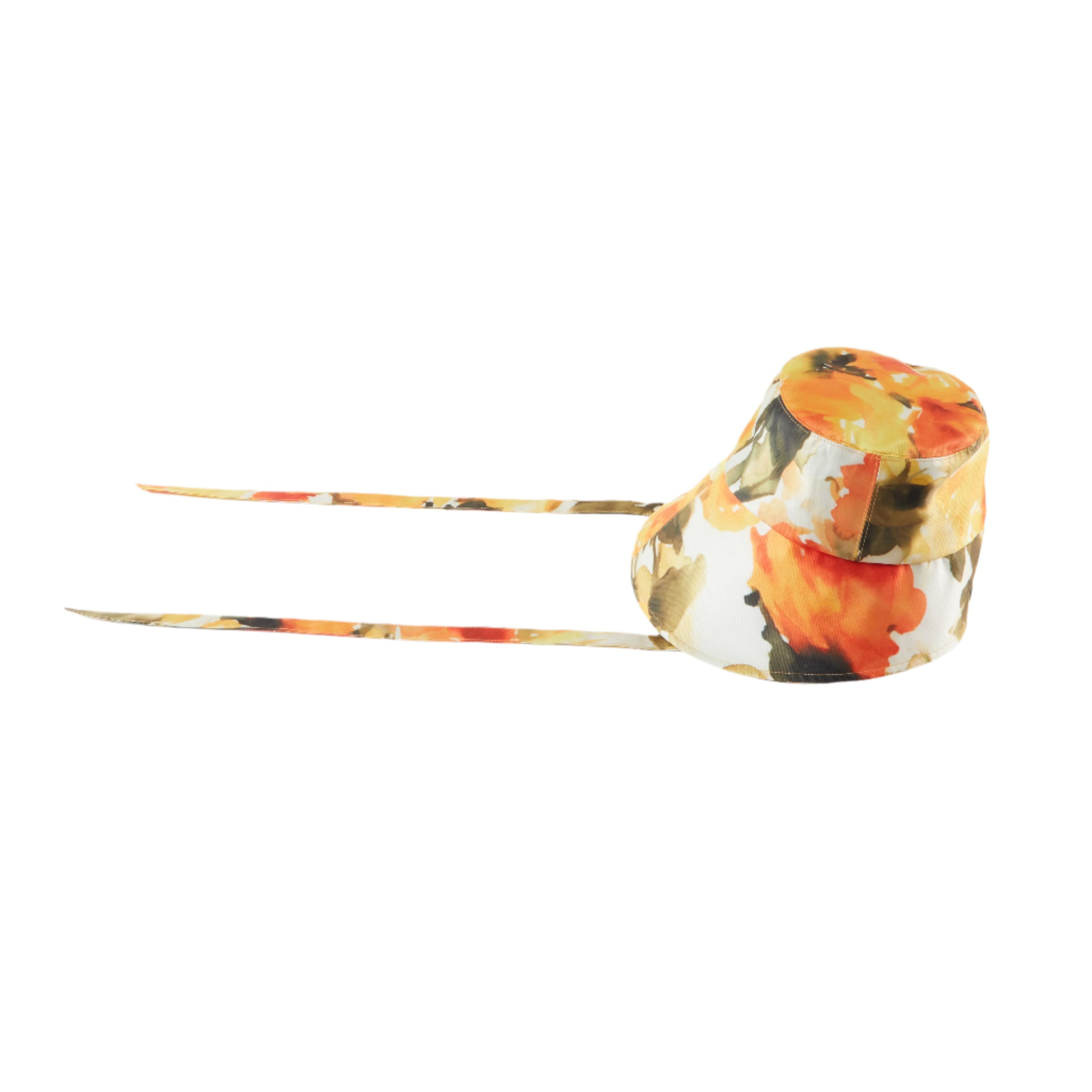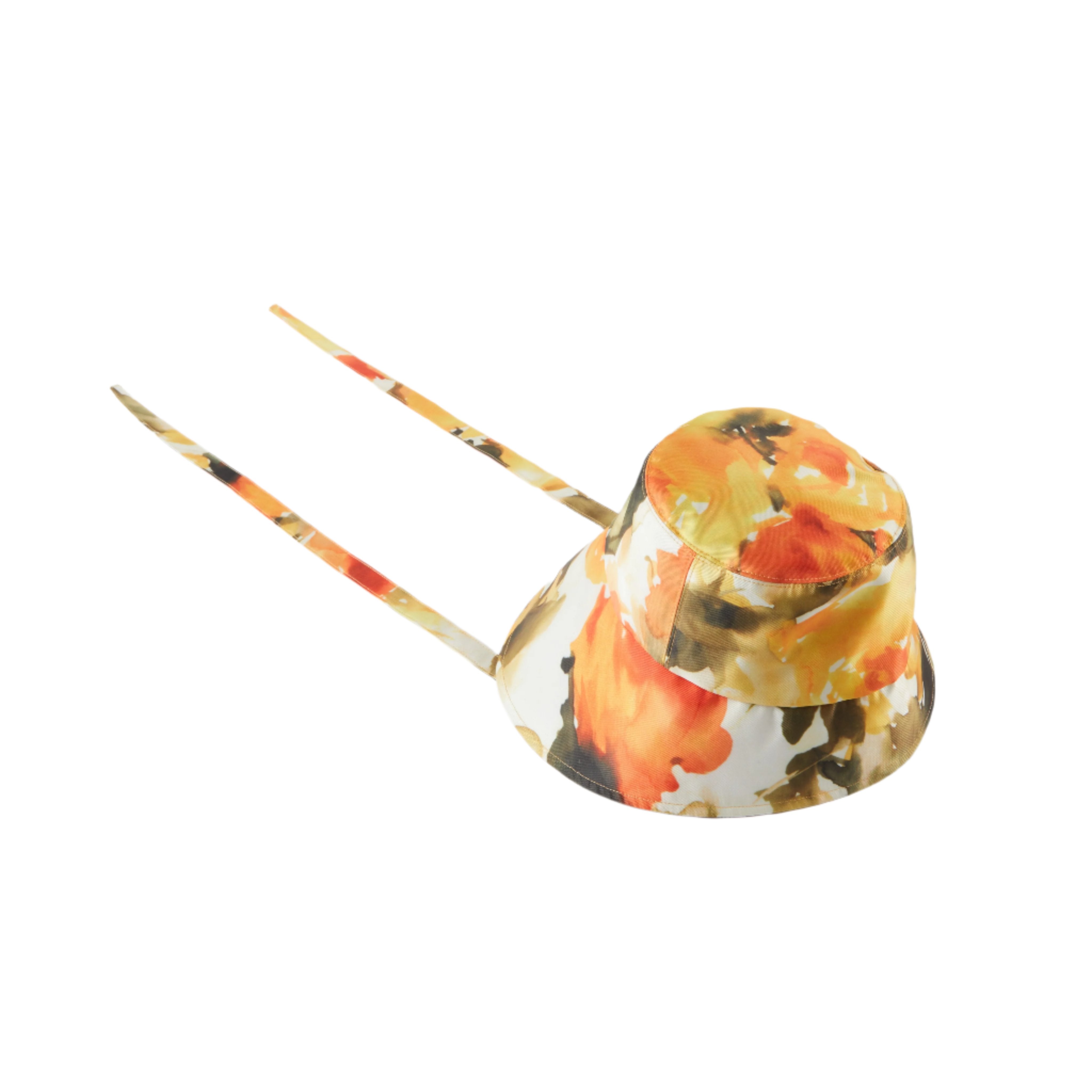 Orange floral-print satin UPF 50+ protection packable asymmetric bucket hat with 14KT gold logo plate-tipped ties.