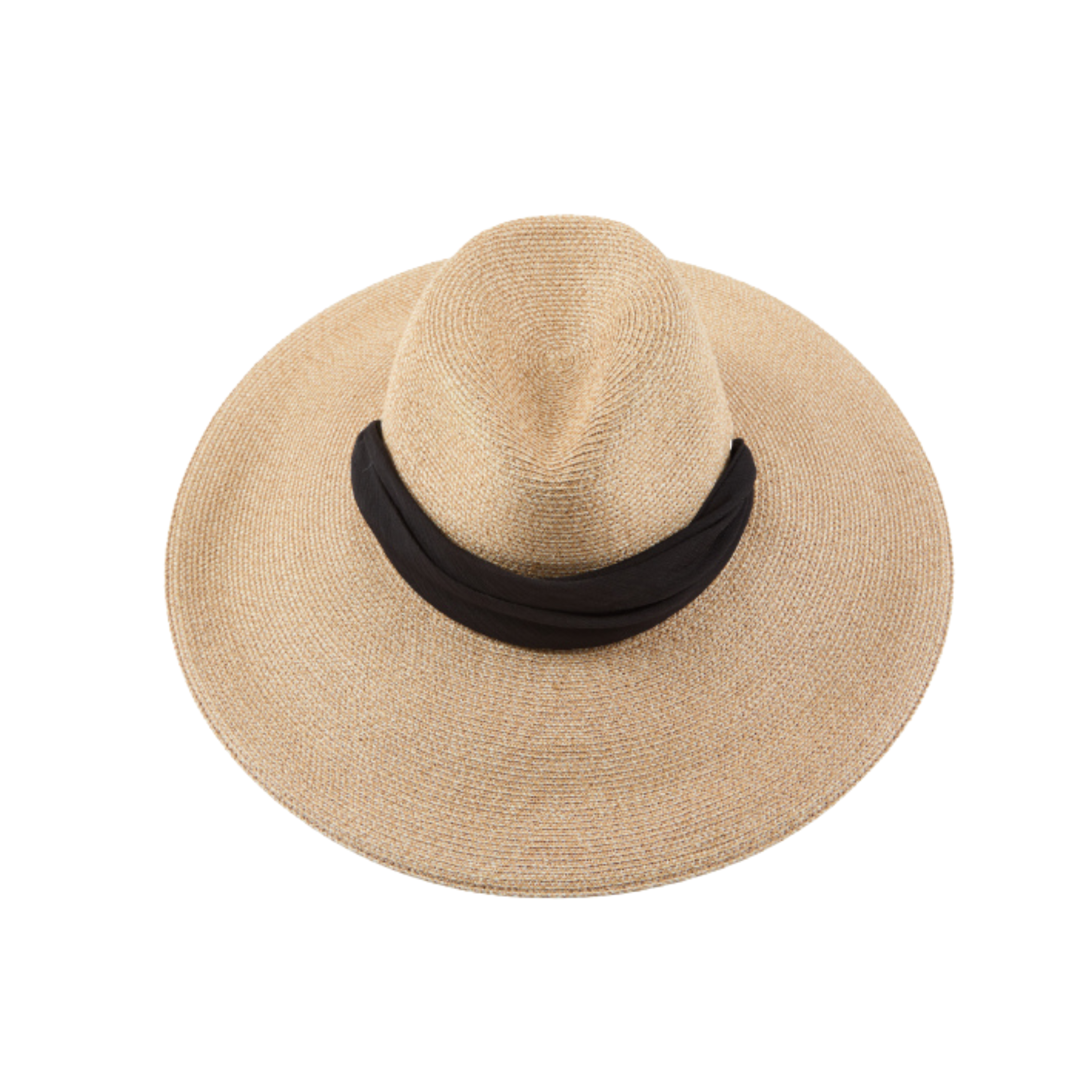 Sand toyo packable UPF 25+ protection wide-brim fedora with black chiffon pull-through scarf and 14K gold grommets.