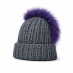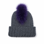 Charcoal chunky wool hand-knit beanie with purple fox mohawk