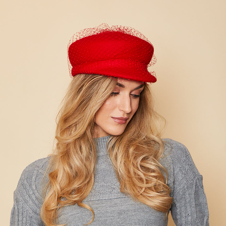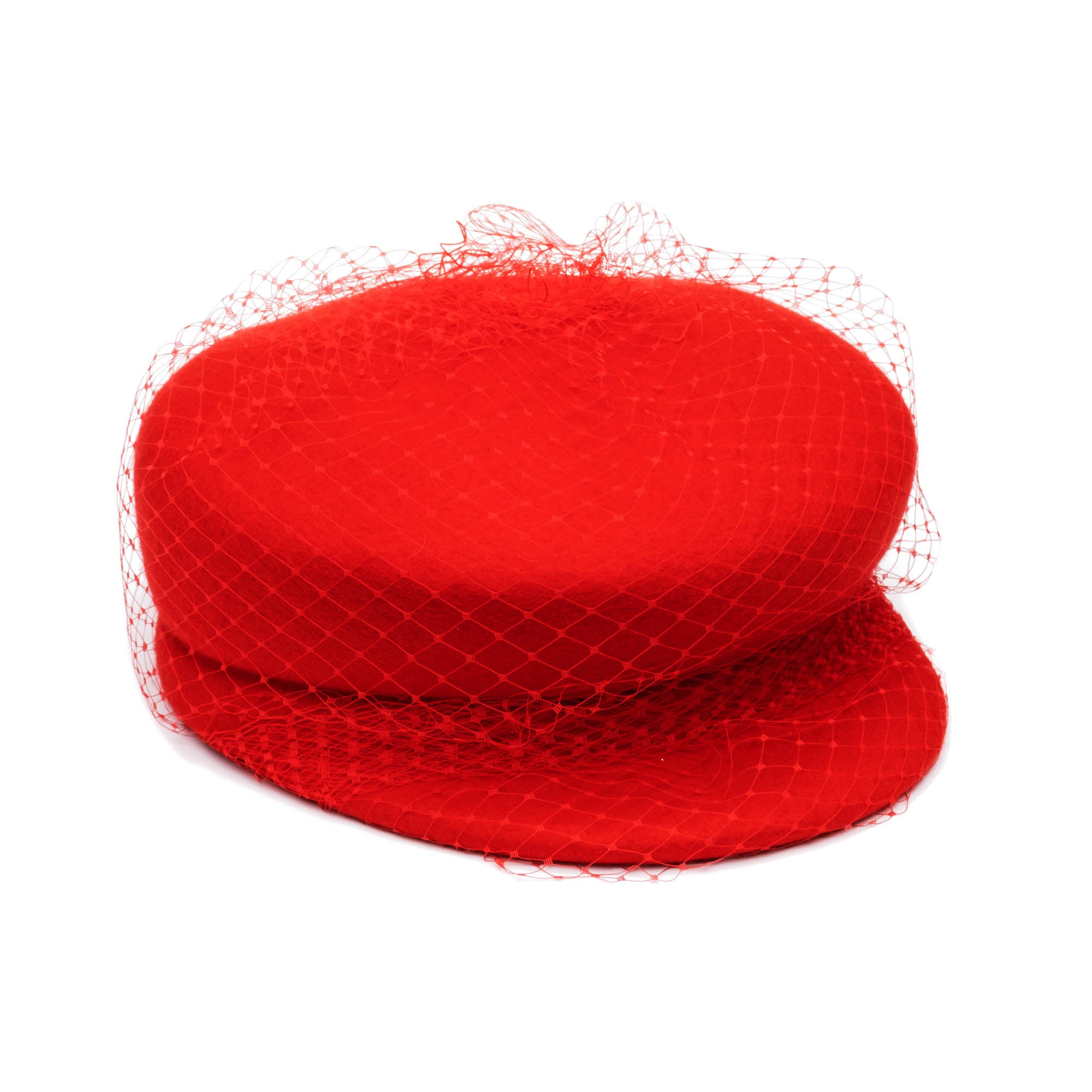 LIMITED EDITION From the Fall/Winter Web Exclusive Collection, we created a red wool felt cap with red birdcage veil overlay