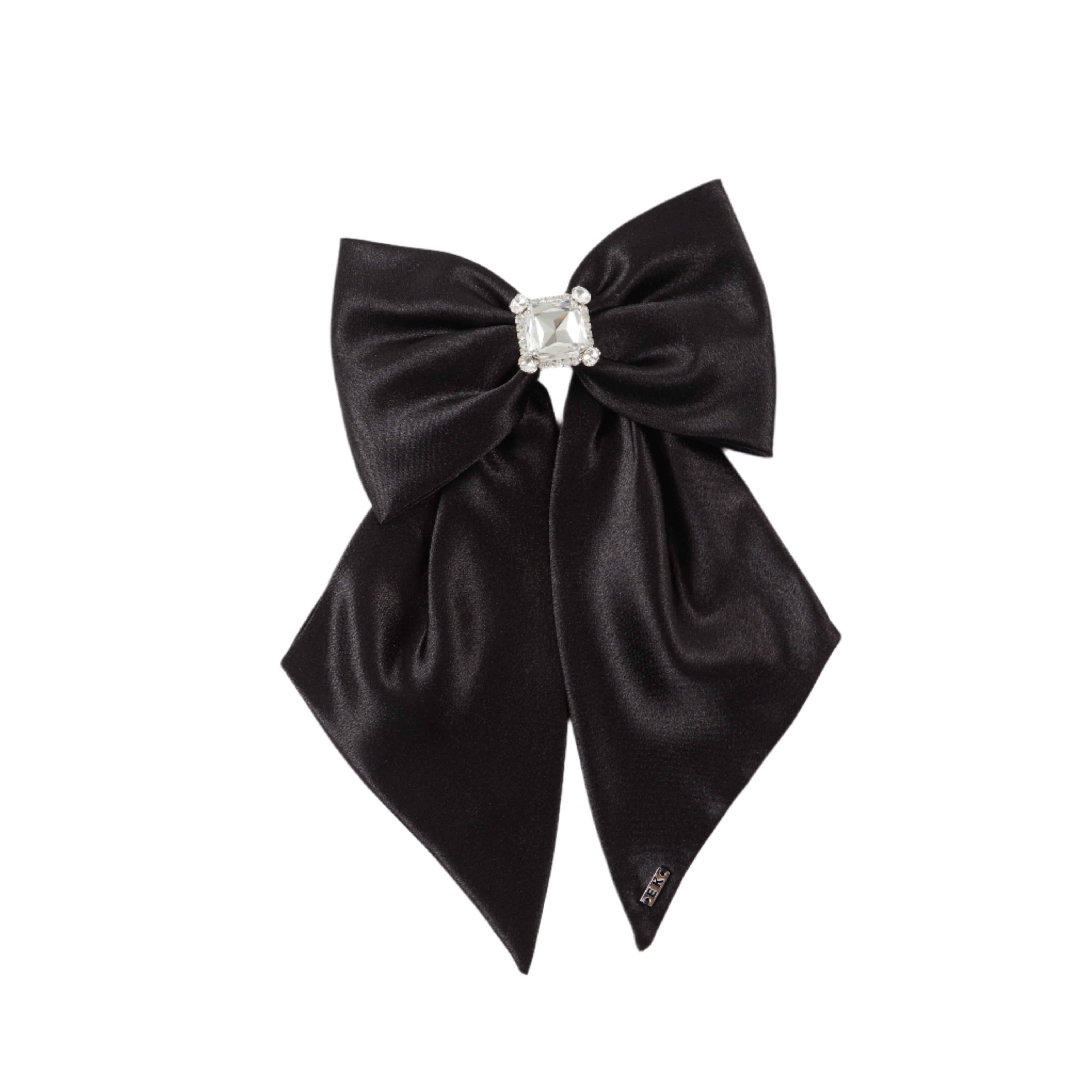 A shiny satin bow barrette with clear crystal brooch and silver logo plate-tipped tails.