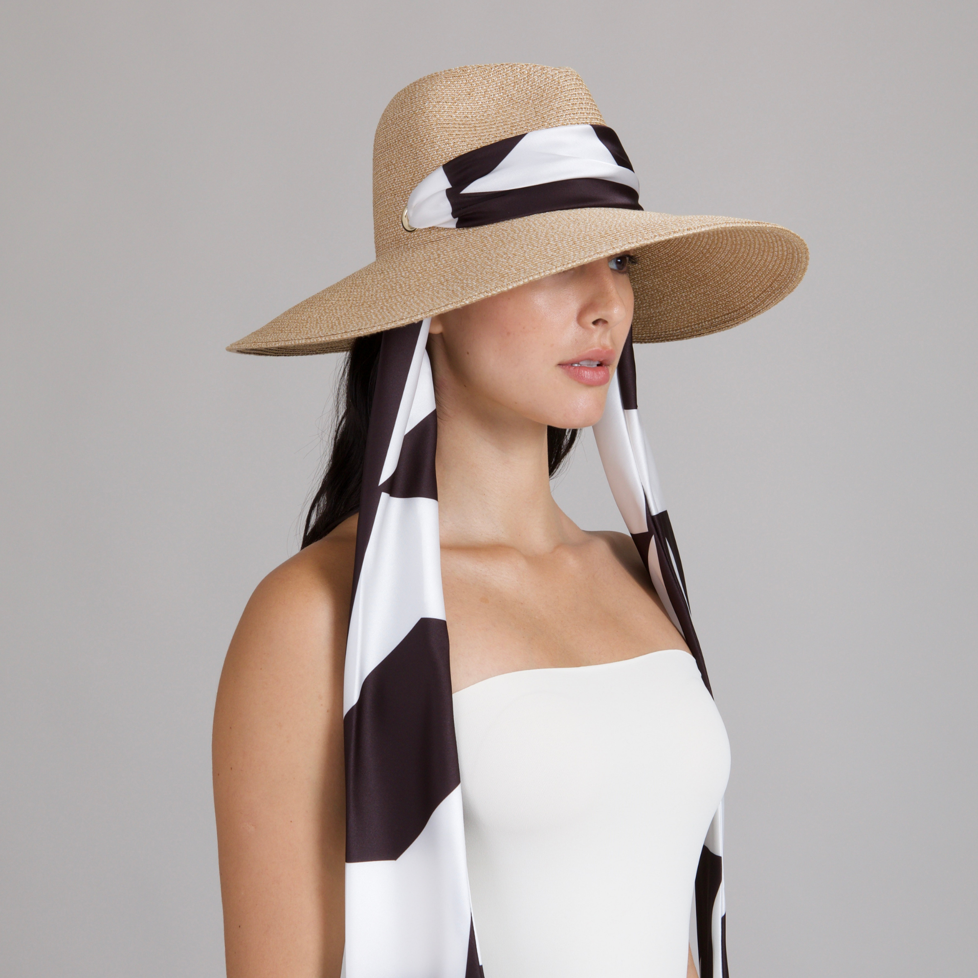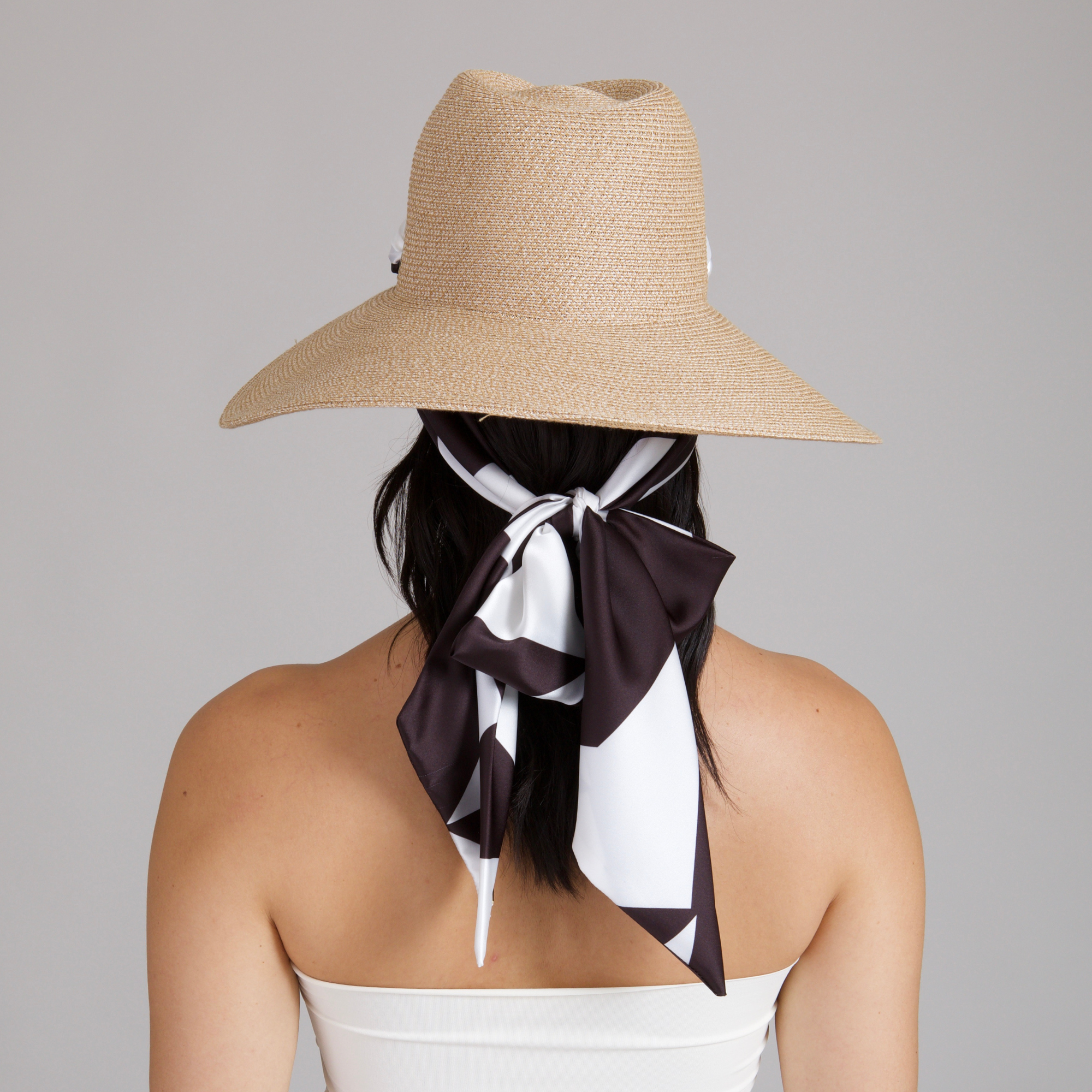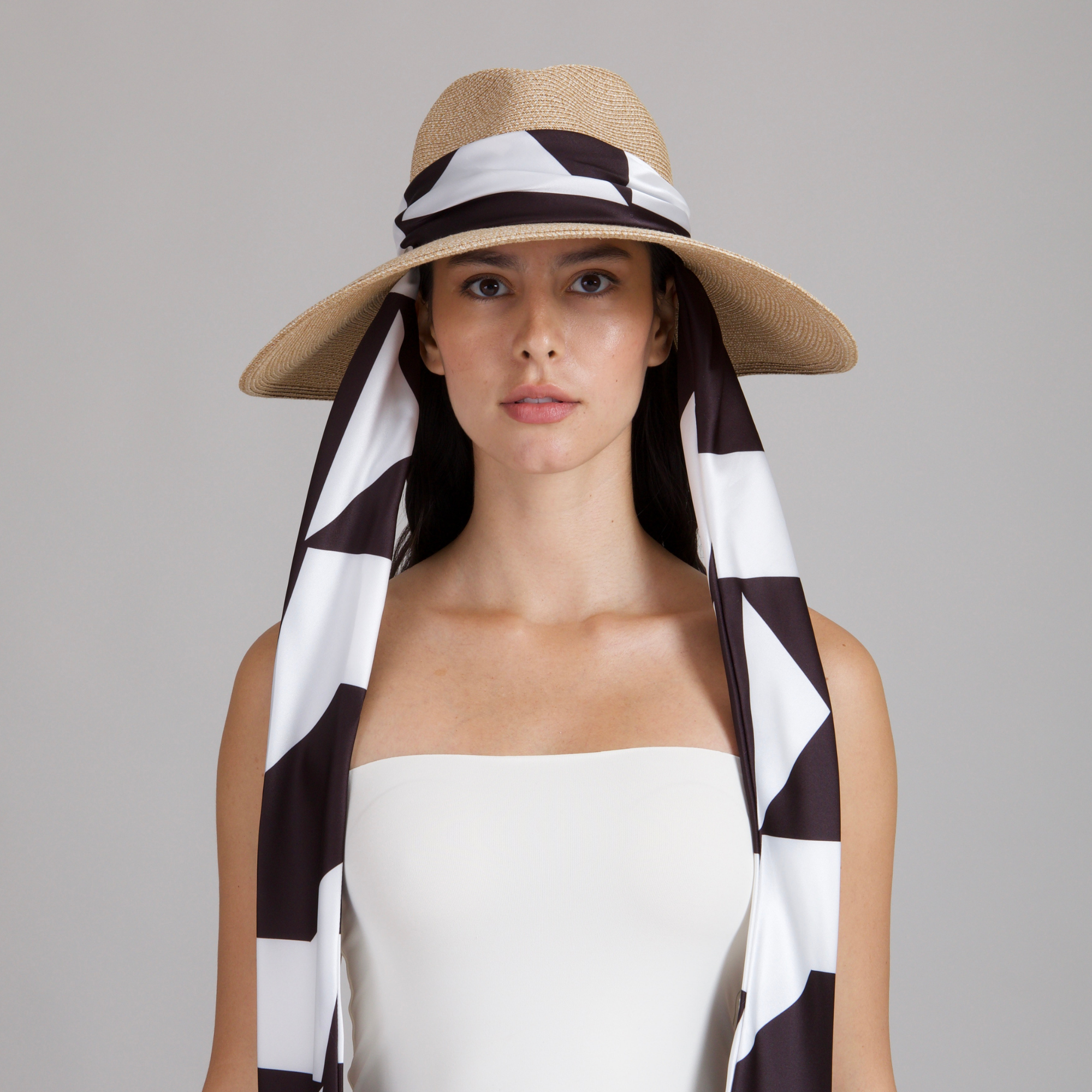 A sun-washed sand toyo wide-brim fedora accented with a striking geometric silk scar, blending effortless glamour with wander-ready function.