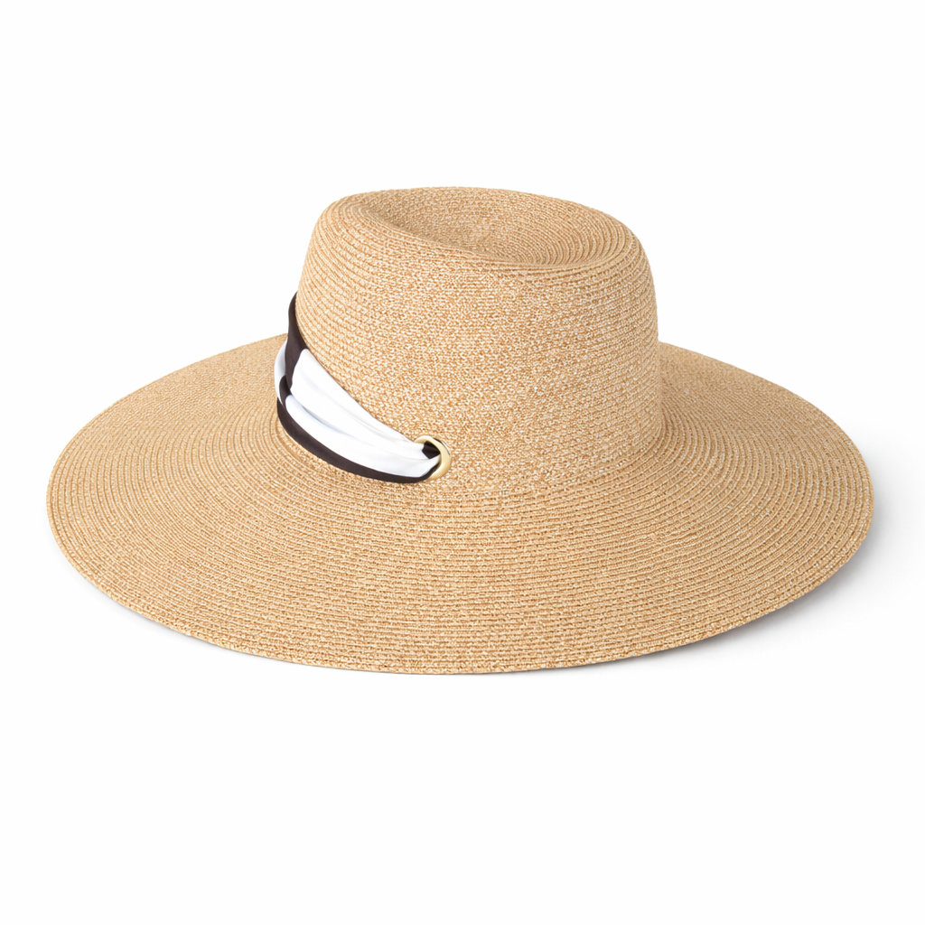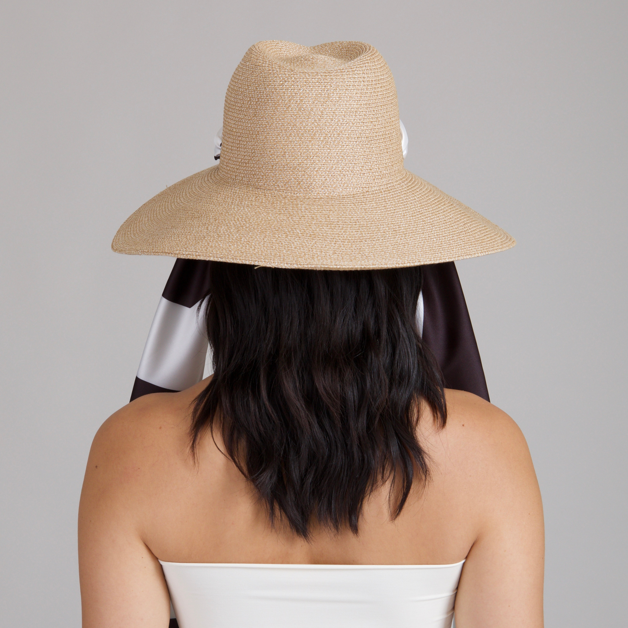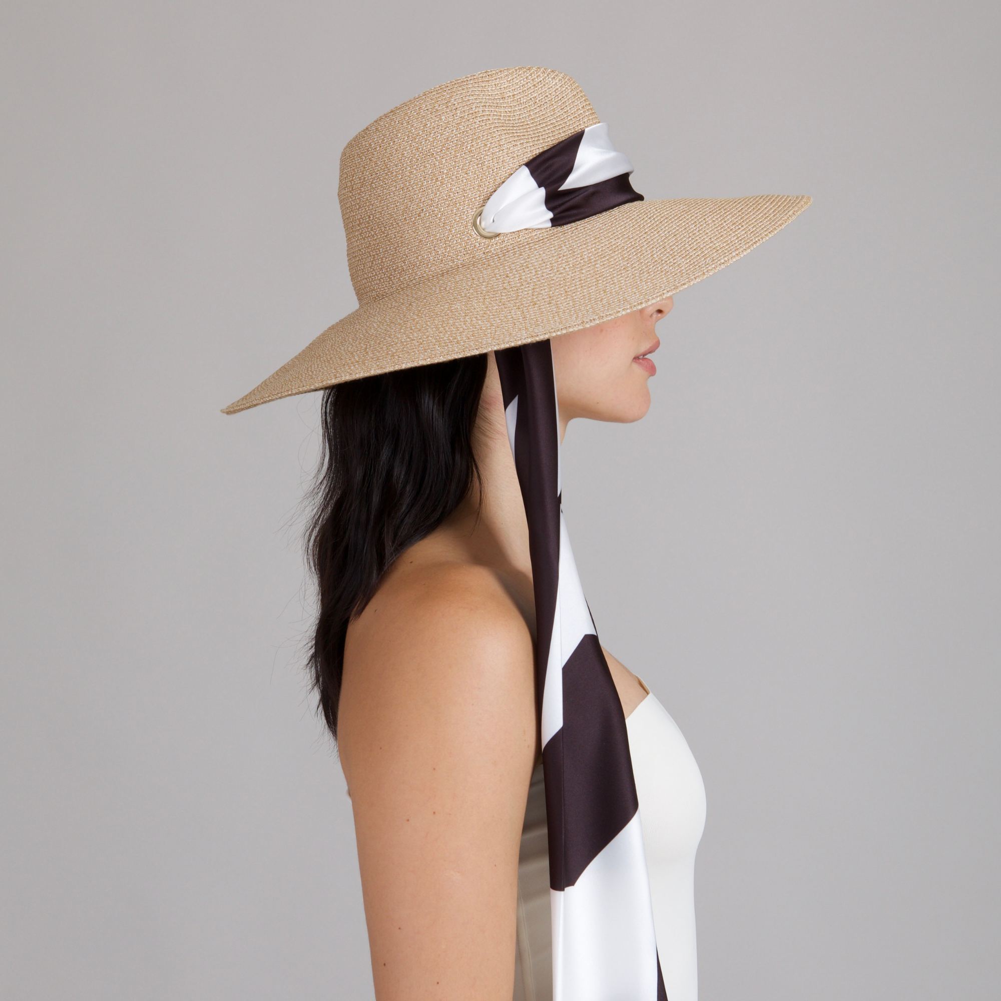 A sun-washed sand toyo wide-brim fedora accented with a striking geometric silk scar, blending effortless glamour with wander-ready function.