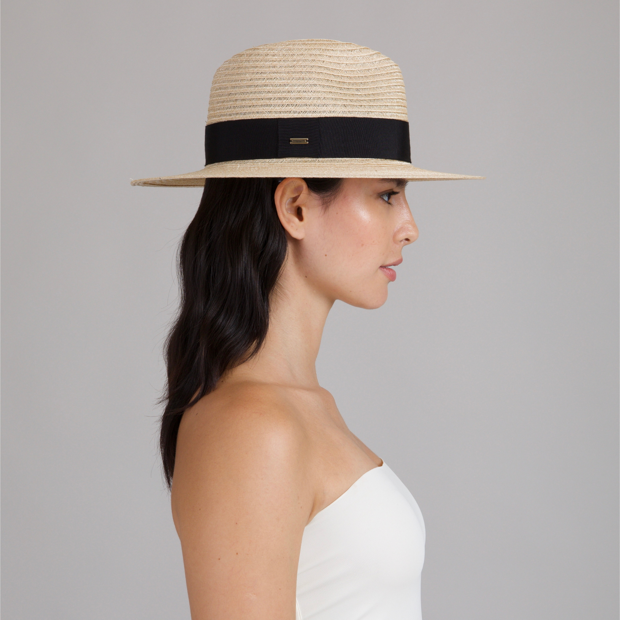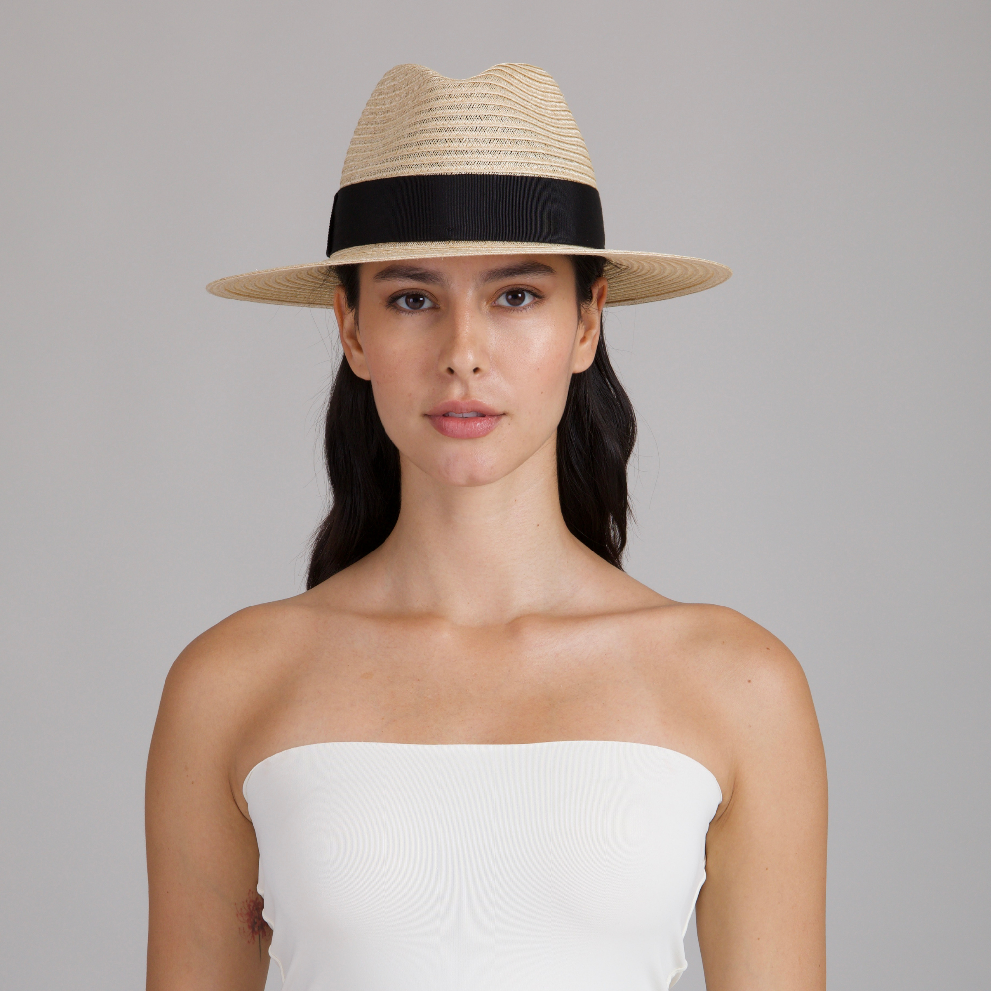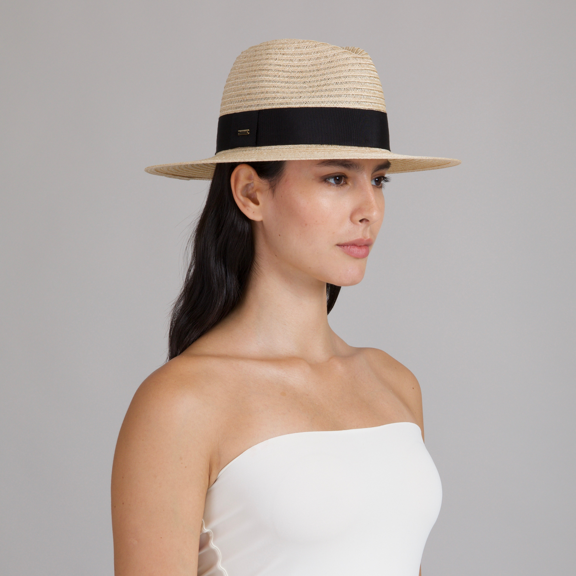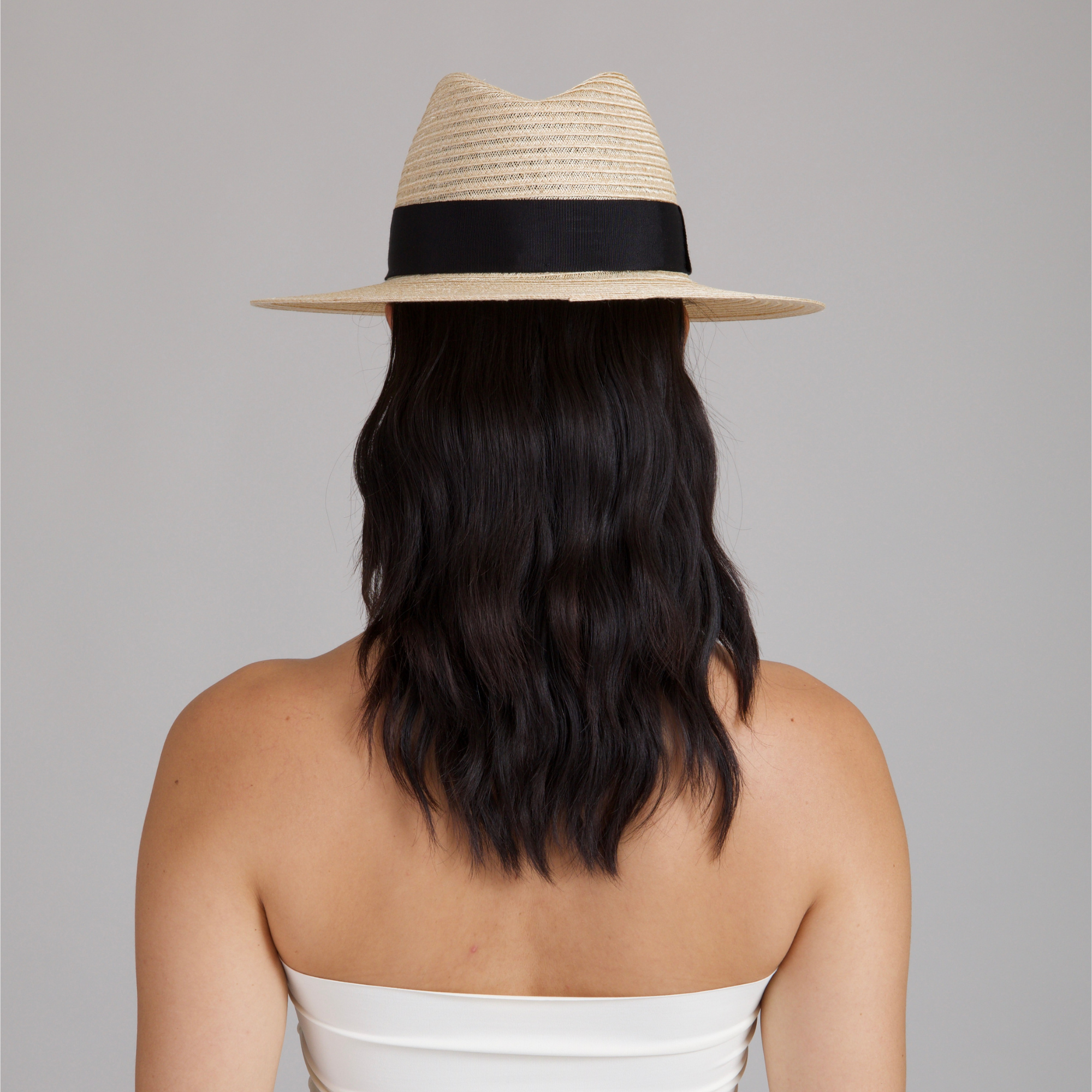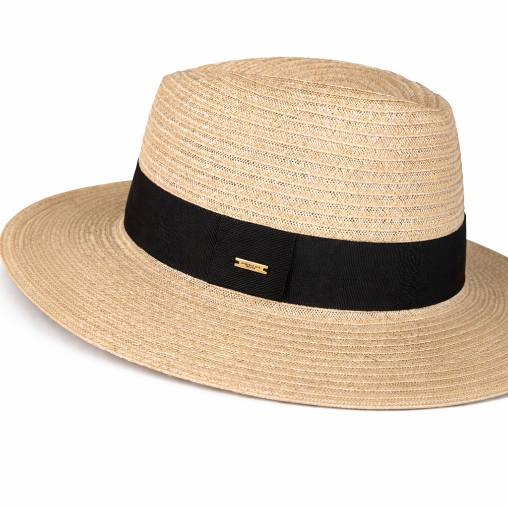 An airy natural vented fedora with a crisp black grosgrain band, made to travel lightly and shade beautifully.