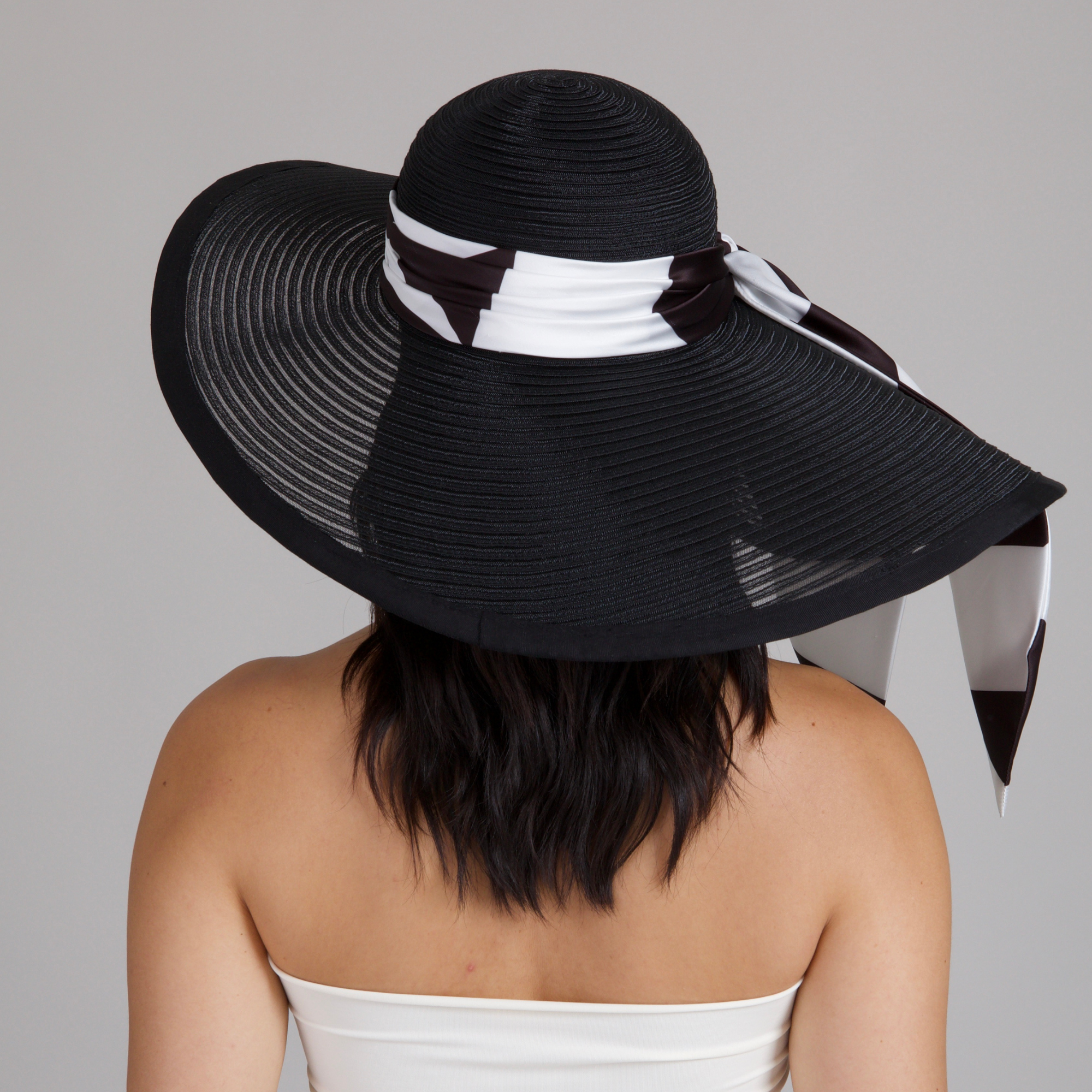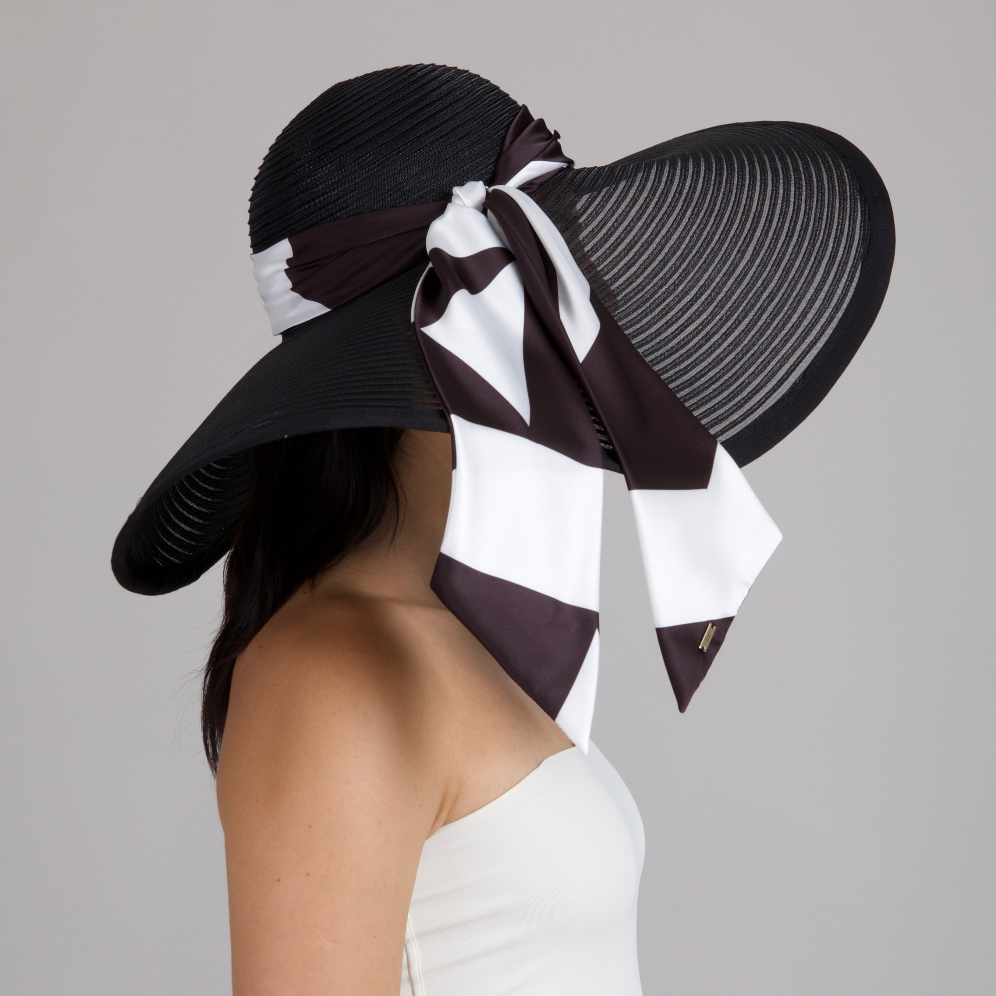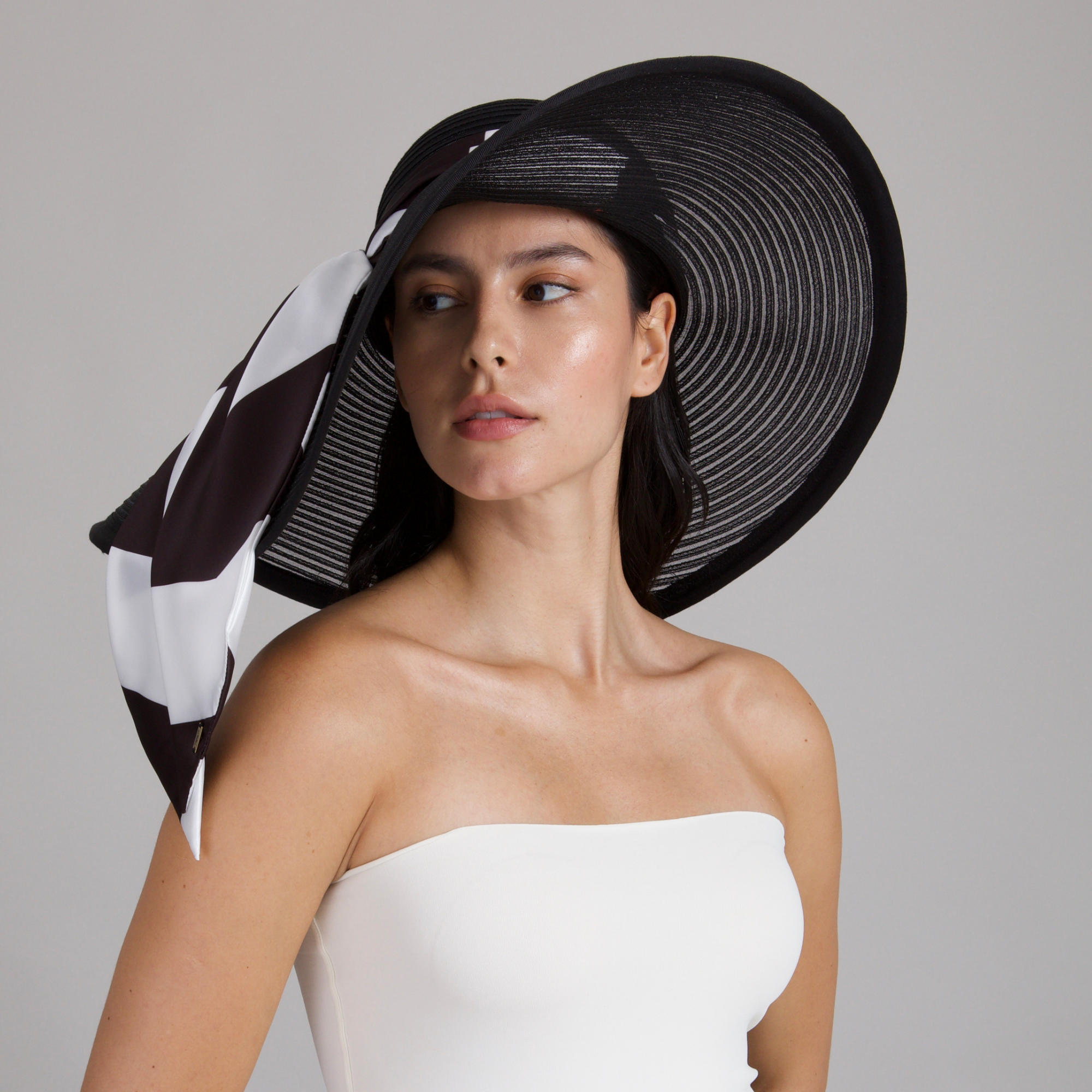 A dramatic black horsehair sunhat with an asymmetric sweep, punctuated by a graphic black-and-white silk scarf for modern allure.