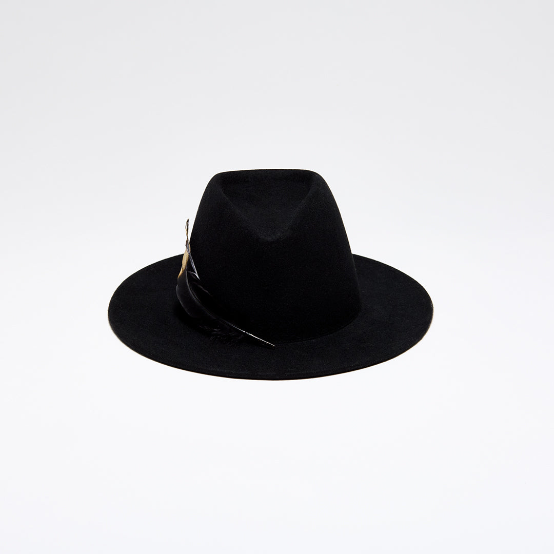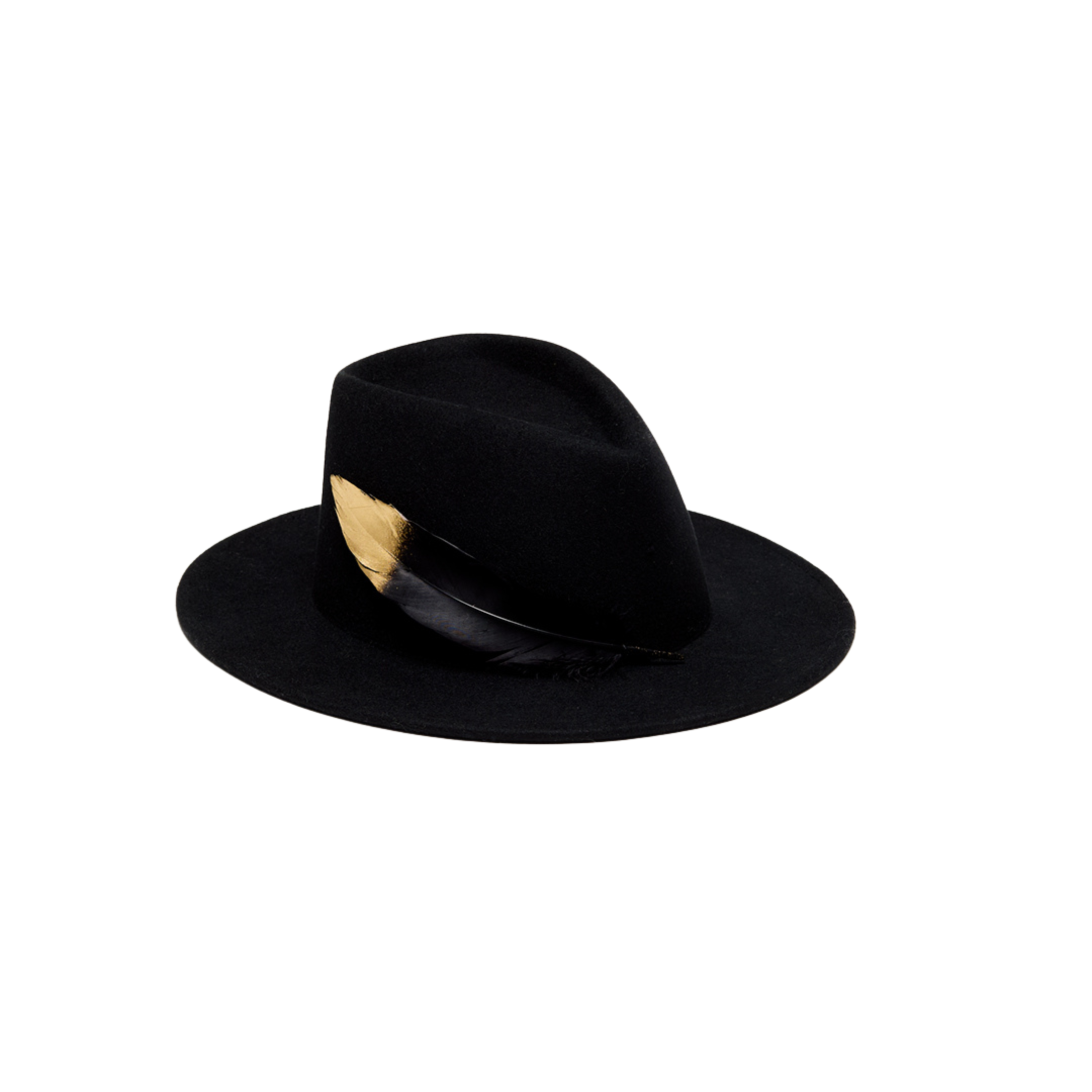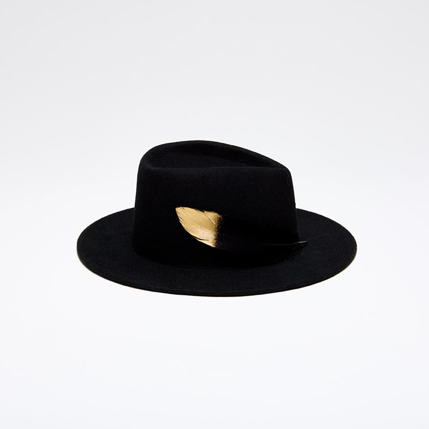 Black wool felt geometric-crown fedora with black gold-tipped feather.