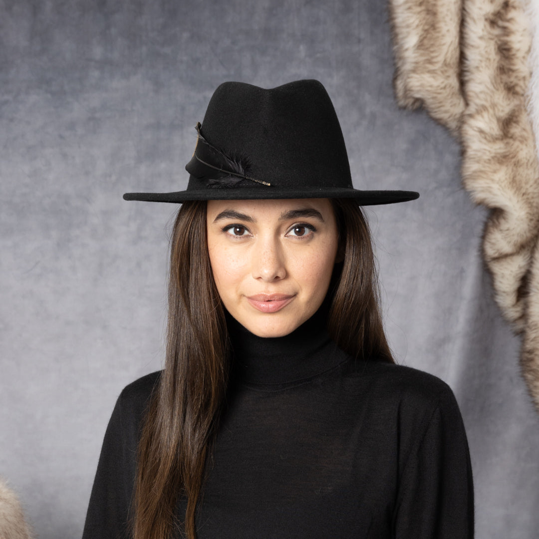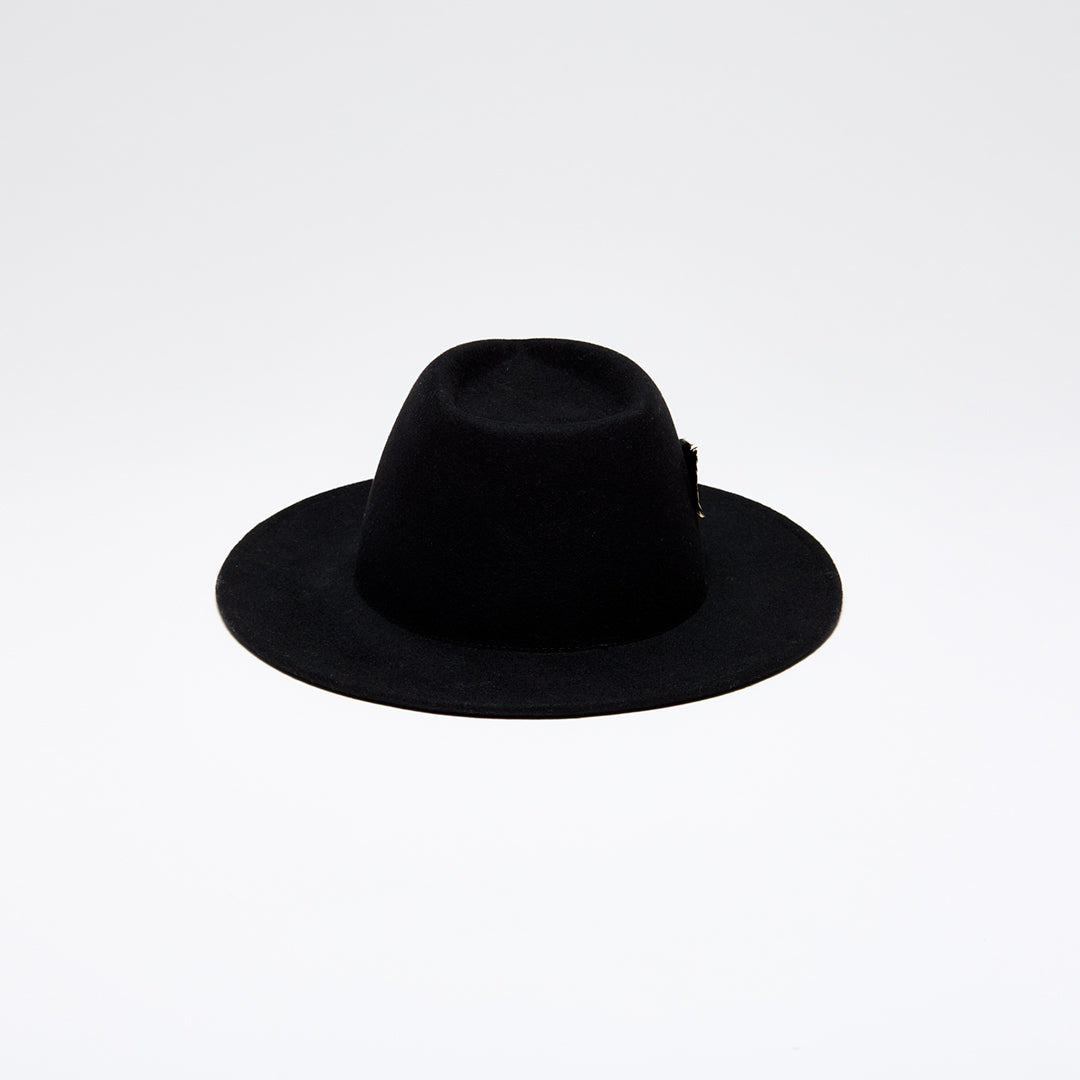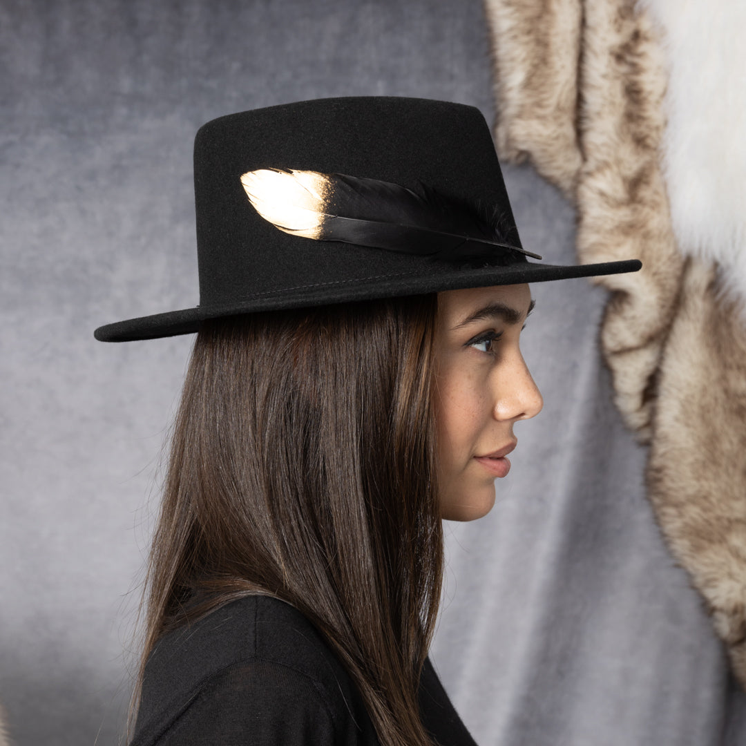 Black wool felt geometric-crown fedora with black gold-tipped feather.