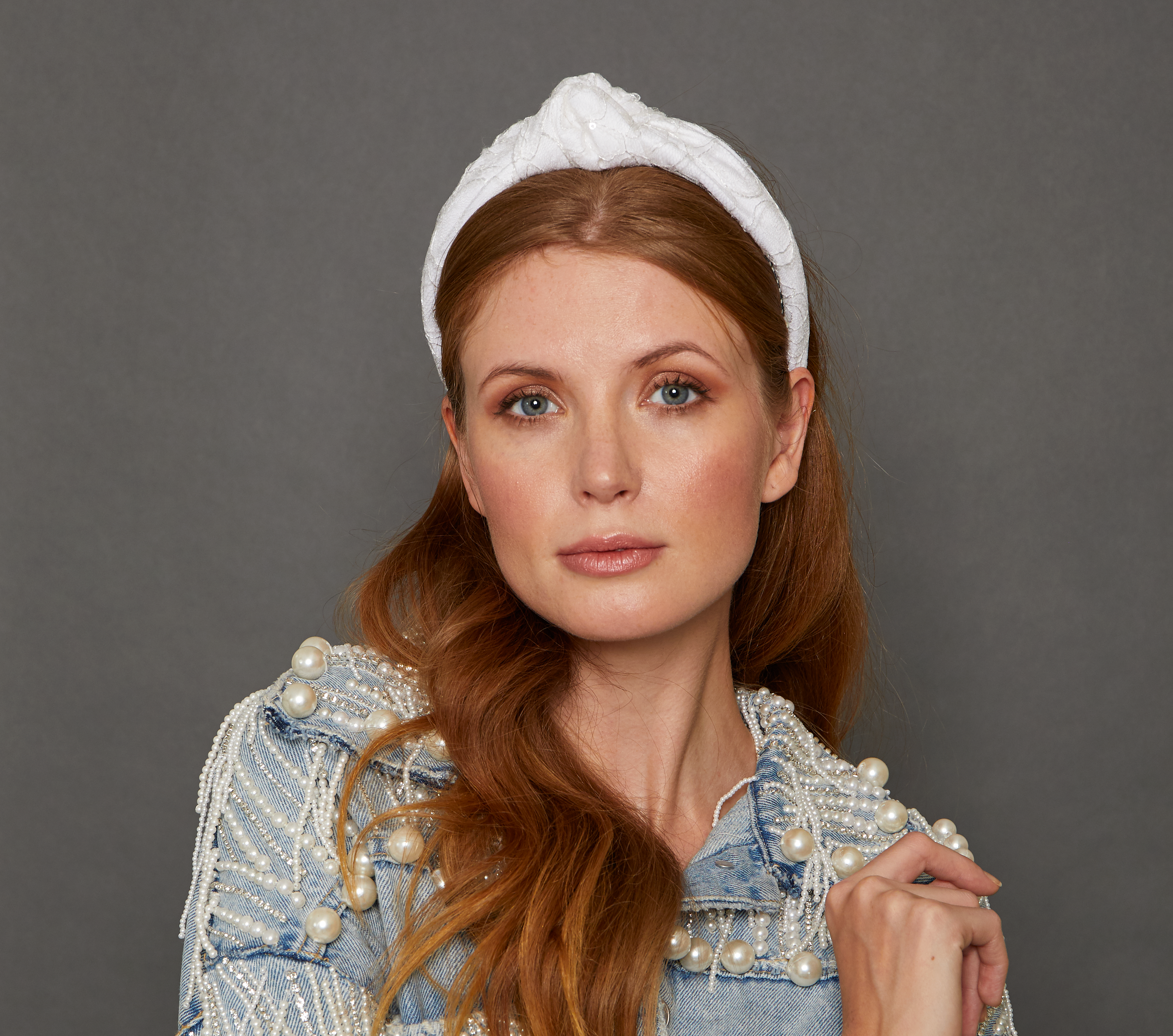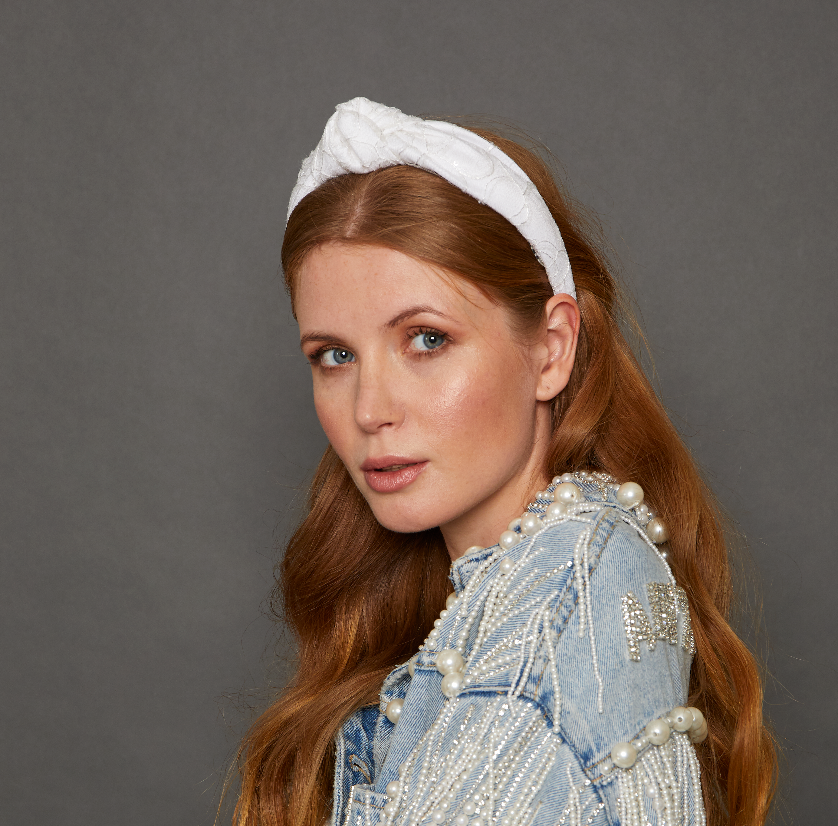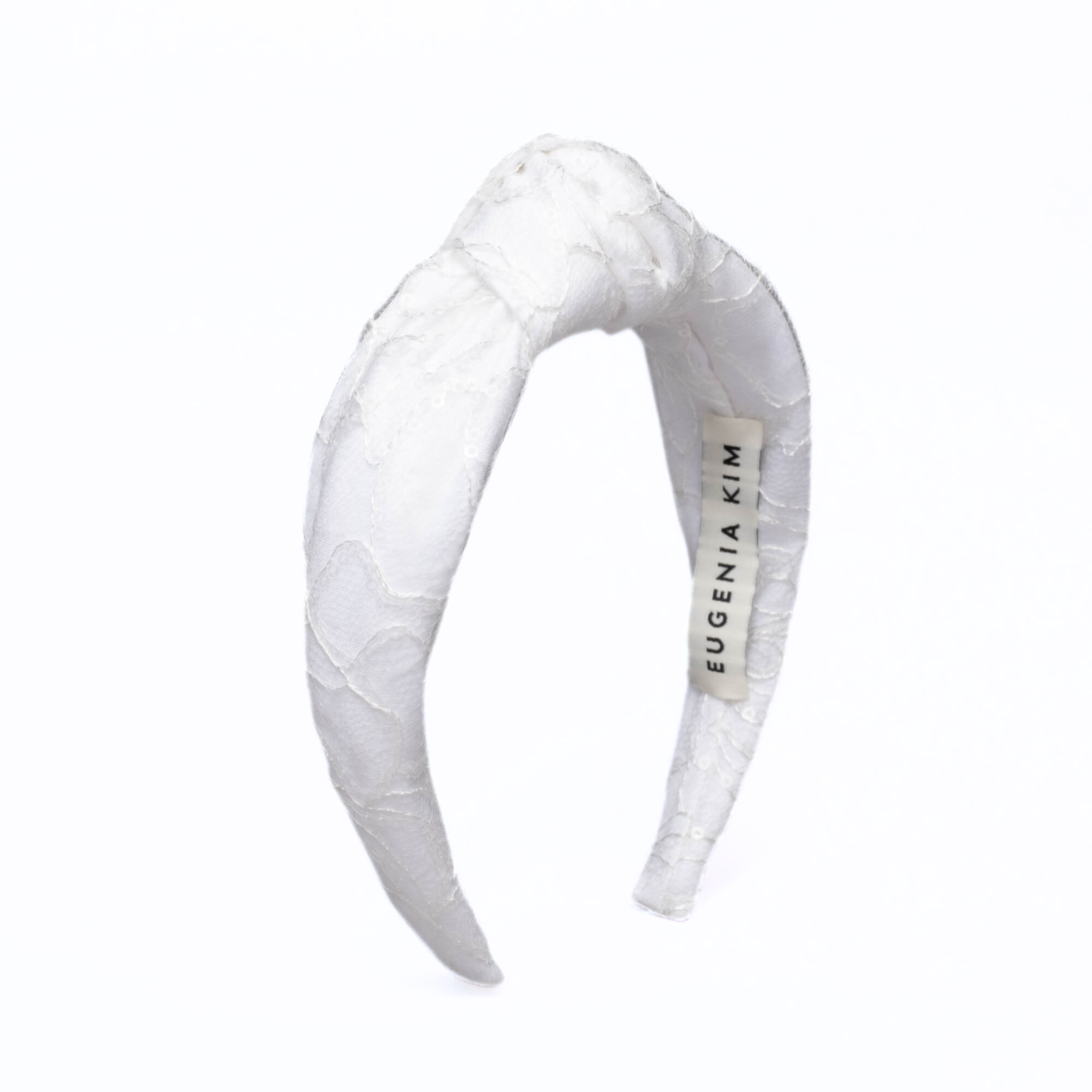 White knotted headband with a sequin and lace overlay in a flower pattern.