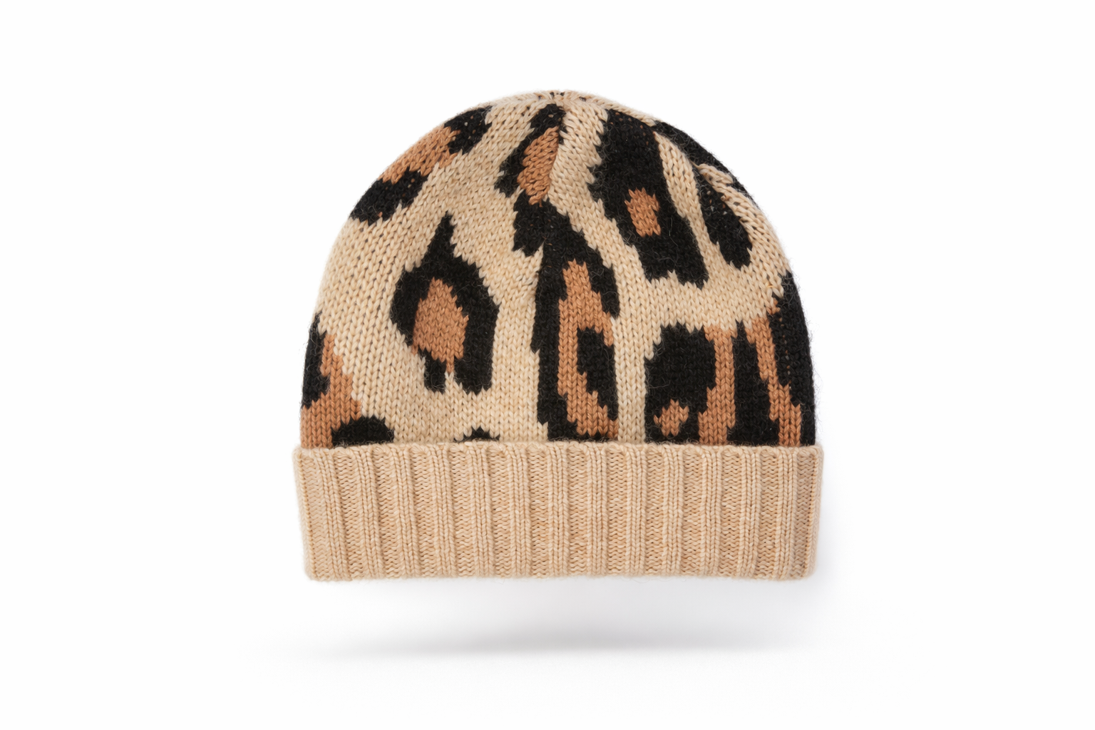 A refined cold-weather essential, this beanie is crafted from pure cashmere and finished with a bold leopard intarsia motif. Soft, lightweight, and naturally insulating, it delivers warmth without bulk while adding a distinctive graphic touch to everyday looks.