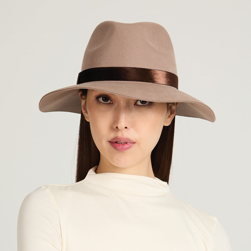 Georgina Mink brushed wool felt fedora with bronze velvet band from the Eugenia Kim Timeless Collection.