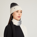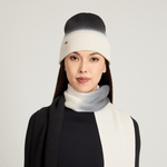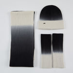 This dip-dye scarf blends ivory and black merino wool in a gentle rib-knit. Made to cocoon you in softness and style as the seasons shift.